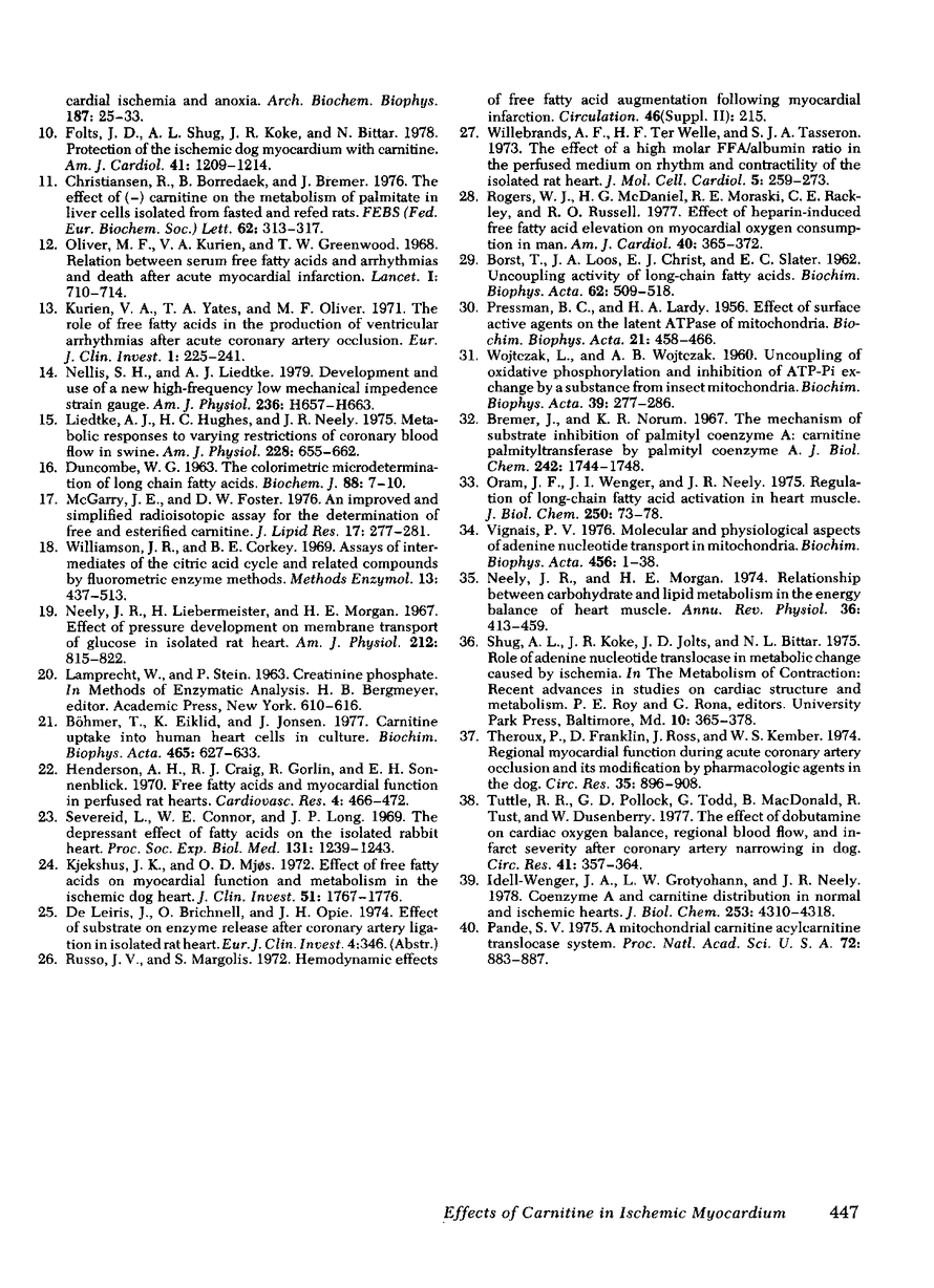 Free fatty acids (FFA) in excess FFA: albumin molar ratios have been determined to additionally compromise mechanical performance in ischemic hearts. Carnitine, an intracellular carrier of FFA and an agent which is lost to the heart during ischemia, has been postulated to in part restore function with its replacement. To test whether its benefits are also operative in a setting of excess FFA, these studies were performed. In the main protocol, four groups of perfused swine hearts (n = 45) were compared during 50 min of control flow (179.7 ml/min) and 40 min of global ischemia (106.1 ml/min). Initial base-line serum FFA:albumin molar ratios and carnitine levels in all groups were 1.3:1 and 8.5 nmol/ml, respectively. In two of these groups FFA:albumin ratios were increased to 5.9:1 with constant infusions of Intralipid. In two alternate groups (one with and one without extra FFA supplements) dl-carnitine was supplied, sufficient to increase serum levels nearly 200-fold. Ischemia per se in 14 hearts significantly decreased several parameters of global and regional mechanical function including left ventricular (LV) and mean aortic pressures, LV isovolumetric pressure development (max dp/dt), LV epicardial motion, and LV work, together with concomitant decreases in myocardial oxygen consumption. Elevated FFA in 12 hearts rendered similarly ischemic further decreased mechanical function (LV pressure: −20.8%, P < 0.05; mean aortic pressure −26.9%, P < 0.05; LV max dp/dt: −39%, P < 0.05; regional LV shortening: −51.1%, P < 0.05; and LV work: −50.3%, P < 0.05) as compared with nonsupplemented hearts. dl-Carnitine treatments in nine hearts, not supplemented with extra FFA were without apparent effect in improving overall hemodynamic performance. However, dl-carnitine in 10 high FFA-ischemic hearts effected several improvements as compared with the untreated group: LV pressure was increased 25.6%, P < 0.025; mean aortic pressure: +43.5%, P < 0.05; LV max dp/dt: +41.5%, P < 0.05; regional LV shortening: +241.3%, P < 0.001; and LV work: +76.2%, P < 0.05 at comparable levels of myocardial oxygen consumption. In a separate protocol, the effects of stereospecificity were also studied by comparing l- with dl-carnitine in globally perfused, palmitate-supplemented hearts (five hearts in each treatment group). At similar conditions of flow and serum FFA, changes in mechanical function were comparable, except for a tendency to perform greater LV work at reduced flows in the l-carnitine-treated hearts. Thus, it was demonstrated that carnitine in ischemic hearts is capable of preserving mechanical function under conditions of excess FFA, presumably by modifying the toxic effects of FFA intermediates. The major therapeutic actions appeared to derive from the l-isomer of carnitine.