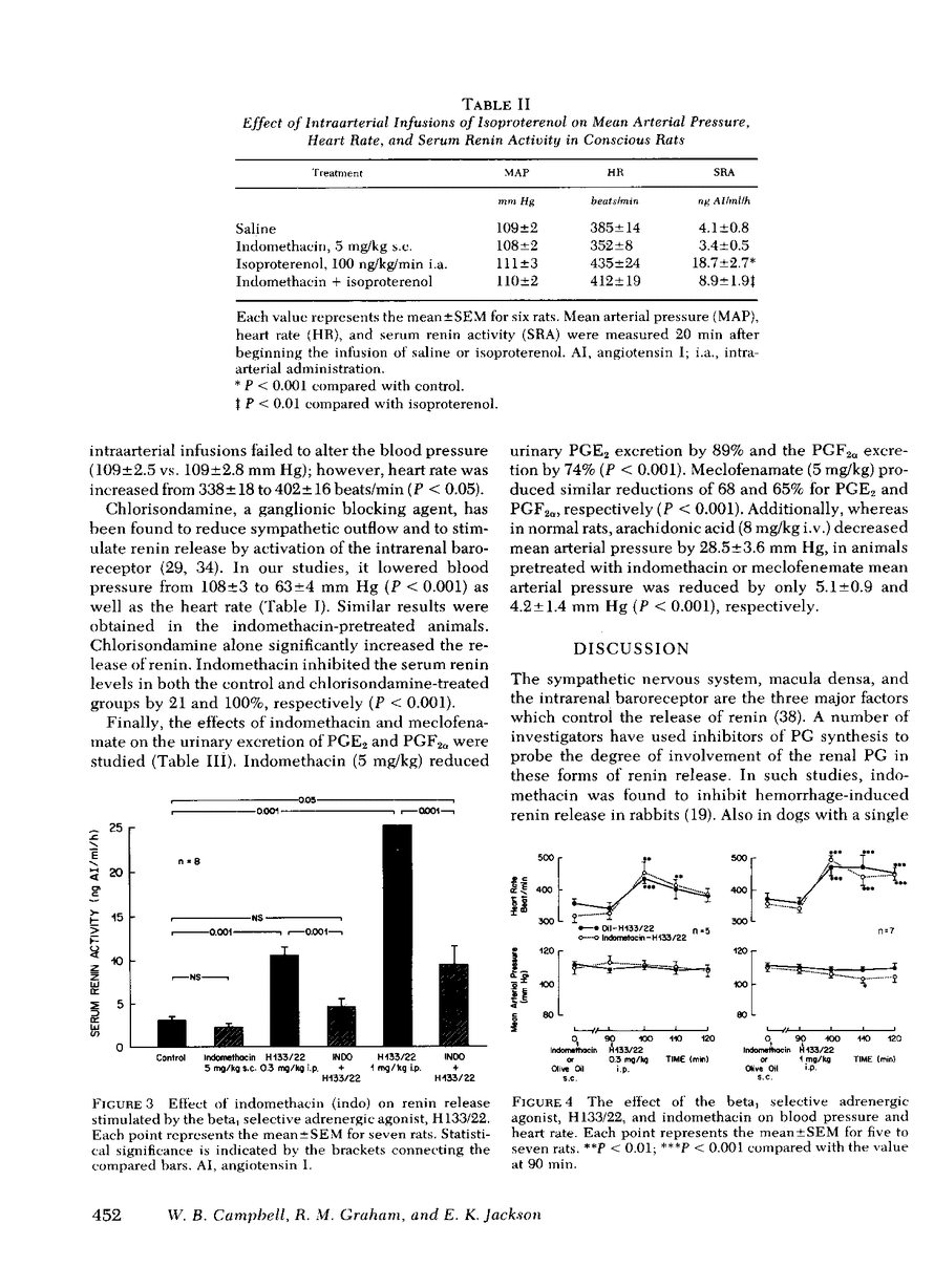 Renal prostaglandins (PG) appear to mediate renin release due to stimulation of the intrarenal baroreceptor, but not that due to activation of the macula densa. However, as the role of PG in sympathetically mediated renin release remains unclear, a possible interrelationship between these factors was examined in conscious rats. Hydralazine increased the serum renin levels from 3.1±0.8 to 16.7±3.0 ng/ml per h at a dose of 1 mg/kg. Indomethacin (5 mg/kg) suppressed urinary PGE2 and PGF2α excretion by 89 and 74%, respectively, arachidonate hypotension by 82%, and inhibited the elevated renin levels from hydralazine by 100% without altering the hypotensive effect of the drug. Another PG synthetase inhibitor, meclofenamate, was also effective in attenuating hydralazine-induced renin release, urinary PGE2 and PGF2α excretion, and arachidonate hypotension. Isoproterenol, a nonselective beta-adrenergic agonist, increased heart rate, lowered blood pressure, and also stimulated the release of renin when administered intraperitoneally. However, intrarenal infusion of the drug only resulted in increased renin release. Indomethacin inhibited isoproterenol-induced renin release by 66 and 67%, respectively, without altering the hemodynamic effects associated with the intraperitoneal administration of the drug. The selective beta1 agonist, H133/22, increased the release of renin and heart rate in a dose-related manner without altering blood pressure. H133/22-induced renin release was inhibited by 80% by indomethacin pretreatment. Finally, intrarenal infusions of dibutyryl cyclic AMP (3 mg/kg per min) increased the serum activity from 4.1±0.2 to 20.4±3.9 ng/ml per h without altering mean arterial pressure. Indomethacin inhibited this renin response to dibutyryl cyclic AMP by 96%. Thus, renal PG appear to be important mediators of sympathetically stimulated renin release acting as a site distal to the beta-adrenergic receptor.