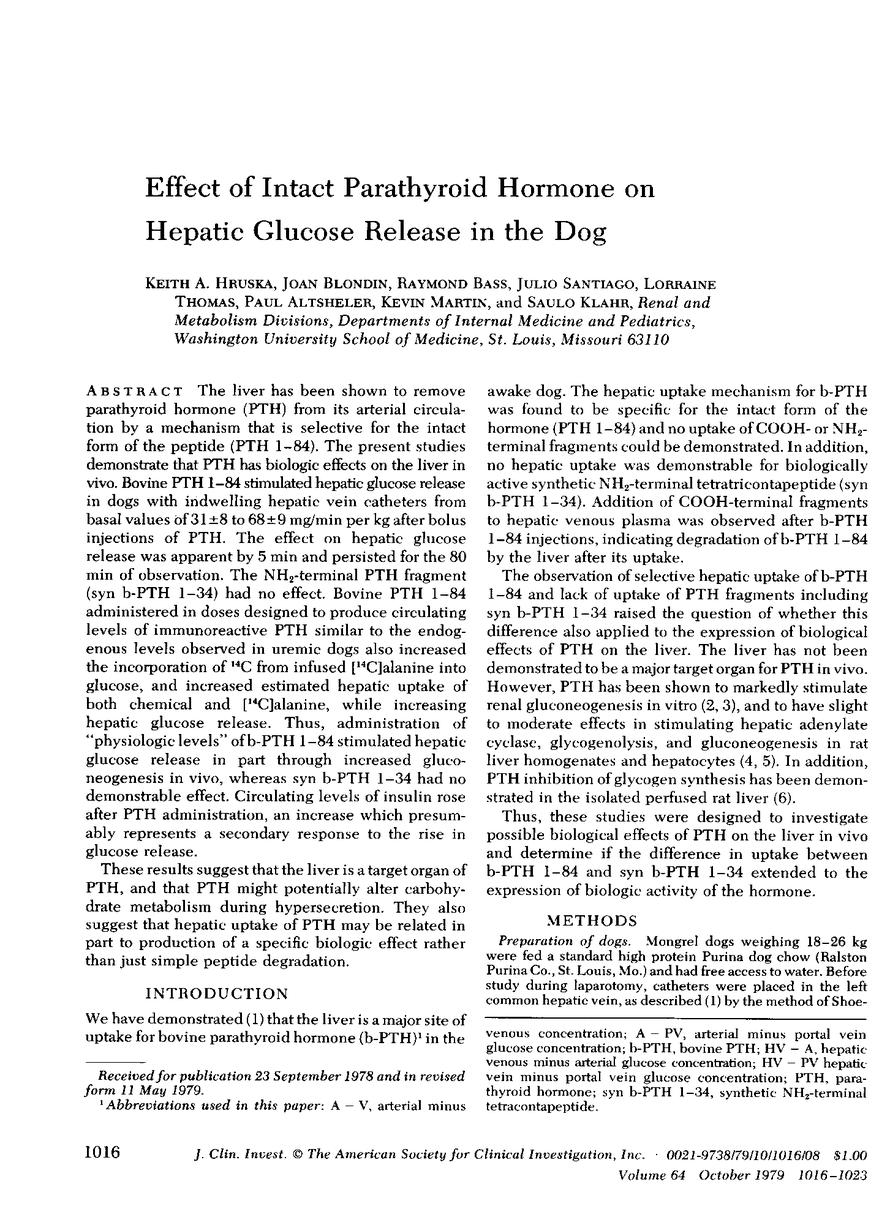 The liver has been shown to remove parathyroid hormone (PTH) from its arterial circulation by a mechanism that is selective for the intact form of the peptide (PTH 1-84). The present studies demonstrate that PTH has biologic effects on the liver in vivo. Bovine PTH 1-84 stimulated hepatic glucose release in dogs with indwelling hepatic vein catheters from basal values of 31±8 to 68±9 mg/min per kg after bolus injections of PTH. The effect on hepatic glucose release was apparent by 5 min and persisted for the 80 min of observation. The NH2-terminal PTH fragment (syn b-PTH 1-34) had no effect. Bovine PTH 1-84 administered in doses designed to produce circulating levels of immunoreactive PTH similar to the endogenous levels observed in uremic dogs also increased the incorporation of 14C from infused [14C]alanine into glucose, and increased estimated hepatic uptake of both chemical and [14C]alanine, while increasing hepatic glucose release. Thus, administration of “physiologic levels” of b-PTH 1-84 stimulated hepatic glucose release in part through increased gluconeogenesis in vivo, whereas syn b-PTH 1-34 had no demonstrable effect. Circulating levels of insulin rose after PTH administration, an increase which presumably represents a secondary response to the rise in glucose release.