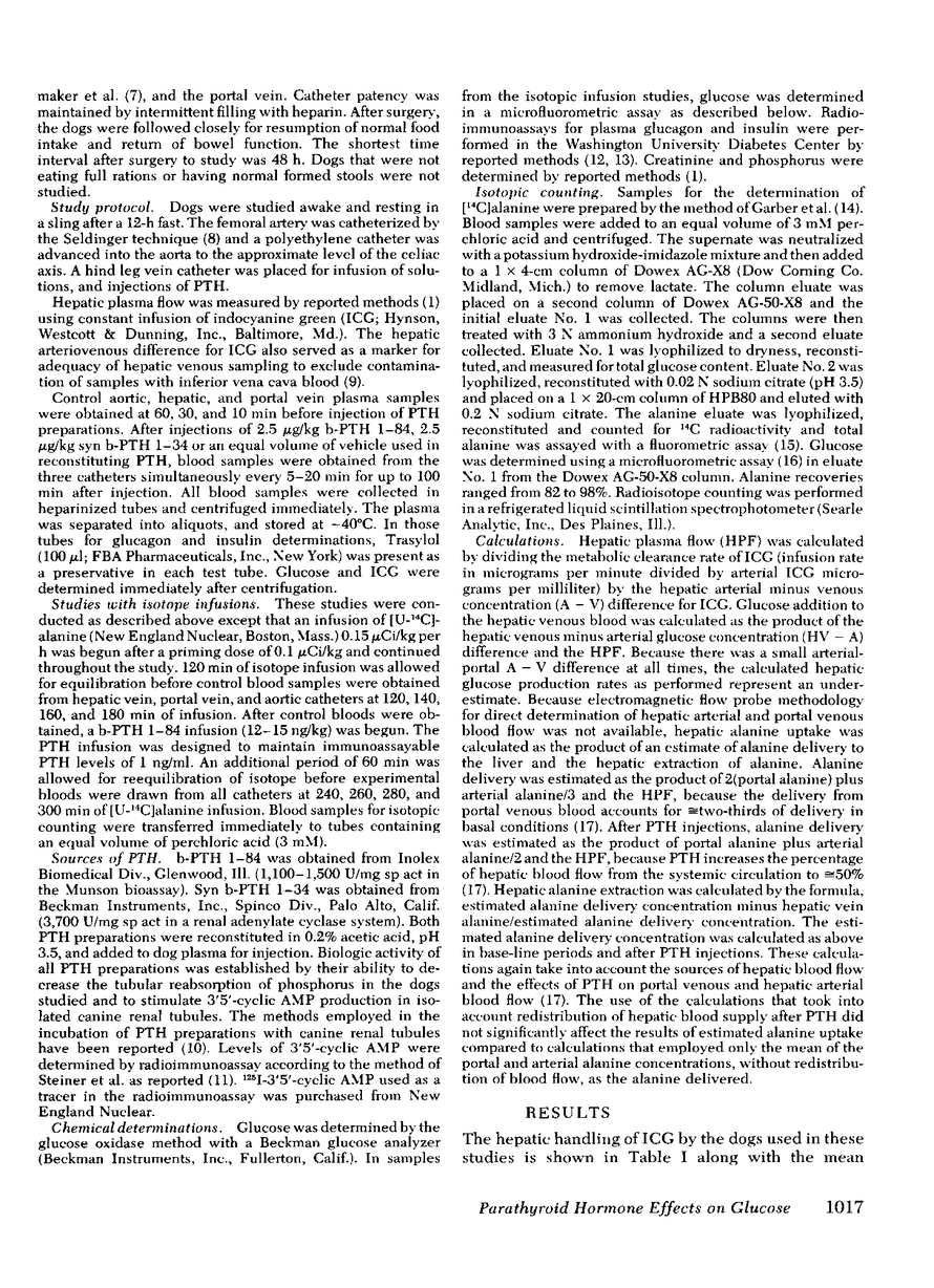 The liver has been shown to remove parathyroid hormone (PTH) from its arterial circulation by a mechanism that is selective for the intact form of the peptide (PTH 1-84). The present studies demonstrate that PTH has biologic effects on the liver in vivo. Bovine PTH 1-84 stimulated hepatic glucose release in dogs with indwelling hepatic vein catheters from basal values of 31±8 to 68±9 mg/min per kg after bolus injections of PTH. The effect on hepatic glucose release was apparent by 5 min and persisted for the 80 min of observation. The NH2-terminal PTH fragment (syn b-PTH 1-34) had no effect. Bovine PTH 1-84 administered in doses designed to produce circulating levels of immunoreactive PTH similar to the endogenous levels observed in uremic dogs also increased the incorporation of 14C from infused [14C]alanine into glucose, and increased estimated hepatic uptake of both chemical and [14C]alanine, while increasing hepatic glucose release. Thus, administration of “physiologic levels” of b-PTH 1-84 stimulated hepatic glucose release in part through increased gluconeogenesis in vivo, whereas syn b-PTH 1-34 had no demonstrable effect. Circulating levels of insulin rose after PTH administration, an increase which presumably represents a secondary response to the rise in glucose release.