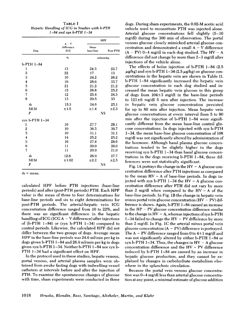 The liver has been shown to remove parathyroid hormone (PTH) from its arterial circulation by a mechanism that is selective for the intact form of the peptide (PTH 1-84). The present studies demonstrate that PTH has biologic effects on the liver in vivo. Bovine PTH 1-84 stimulated hepatic glucose release in dogs with indwelling hepatic vein catheters from basal values of 31±8 to 68±9 mg/min per kg after bolus injections of PTH. The effect on hepatic glucose release was apparent by 5 min and persisted for the 80 min of observation. The NH2-terminal PTH fragment (syn b-PTH 1-34) had no effect. Bovine PTH 1-84 administered in doses designed to produce circulating levels of immunoreactive PTH similar to the endogenous levels observed in uremic dogs also increased the incorporation of 14C from infused [14C]alanine into glucose, and increased estimated hepatic uptake of both chemical and [14C]alanine, while increasing hepatic glucose release. Thus, administration of “physiologic levels” of b-PTH 1-84 stimulated hepatic glucose release in part through increased gluconeogenesis in vivo, whereas syn b-PTH 1-34 had no demonstrable effect. Circulating levels of insulin rose after PTH administration, an increase which presumably represents a secondary response to the rise in glucose release.