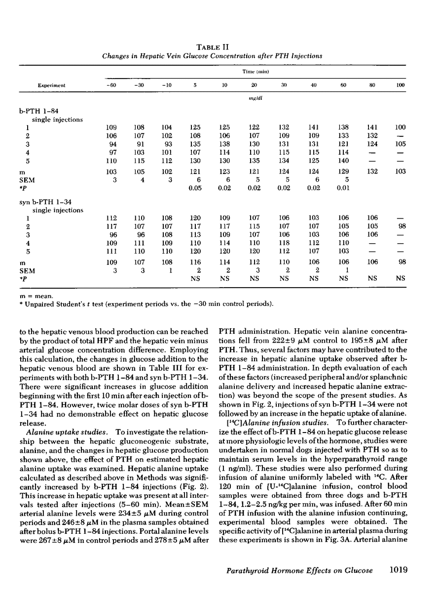 The liver has been shown to remove parathyroid hormone (PTH) from its arterial circulation by a mechanism that is selective for the intact form of the peptide (PTH 1-84). The present studies demonstrate that PTH has biologic effects on the liver in vivo. Bovine PTH 1-84 stimulated hepatic glucose release in dogs with indwelling hepatic vein catheters from basal values of 31±8 to 68±9 mg/min per kg after bolus injections of PTH. The effect on hepatic glucose release was apparent by 5 min and persisted for the 80 min of observation. The NH2-terminal PTH fragment (syn b-PTH 1-34) had no effect. Bovine PTH 1-84 administered in doses designed to produce circulating levels of immunoreactive PTH similar to the endogenous levels observed in uremic dogs also increased the incorporation of 14C from infused [14C]alanine into glucose, and increased estimated hepatic uptake of both chemical and [14C]alanine, while increasing hepatic glucose release. Thus, administration of “physiologic levels” of b-PTH 1-84 stimulated hepatic glucose release in part through increased gluconeogenesis in vivo, whereas syn b-PTH 1-34 had no demonstrable effect. Circulating levels of insulin rose after PTH administration, an increase which presumably represents a secondary response to the rise in glucose release.