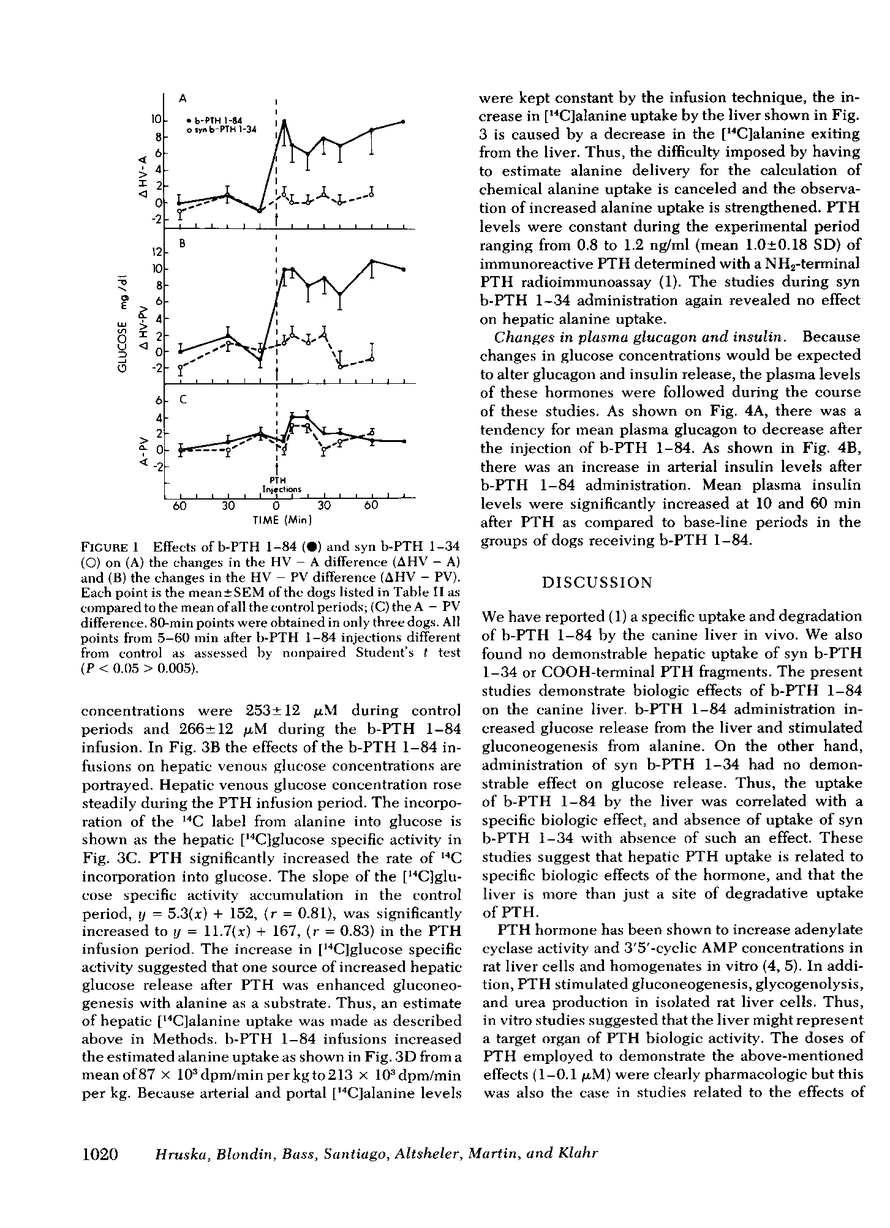 The liver has been shown to remove parathyroid hormone (PTH) from its arterial circulation by a mechanism that is selective for the intact form of the peptide (PTH 1-84). The present studies demonstrate that PTH has biologic effects on the liver in vivo. Bovine PTH 1-84 stimulated hepatic glucose release in dogs with indwelling hepatic vein catheters from basal values of 31±8 to 68±9 mg/min per kg after bolus injections of PTH. The effect on hepatic glucose release was apparent by 5 min and persisted for the 80 min of observation. The NH2-terminal PTH fragment (syn b-PTH 1-34) had no effect. Bovine PTH 1-84 administered in doses designed to produce circulating levels of immunoreactive PTH similar to the endogenous levels observed in uremic dogs also increased the incorporation of 14C from infused [14C]alanine into glucose, and increased estimated hepatic uptake of both chemical and [14C]alanine, while increasing hepatic glucose release. Thus, administration of “physiologic levels” of b-PTH 1-84 stimulated hepatic glucose release in part through increased gluconeogenesis in vivo, whereas syn b-PTH 1-34 had no demonstrable effect. Circulating levels of insulin rose after PTH administration, an increase which presumably represents a secondary response to the rise in glucose release.