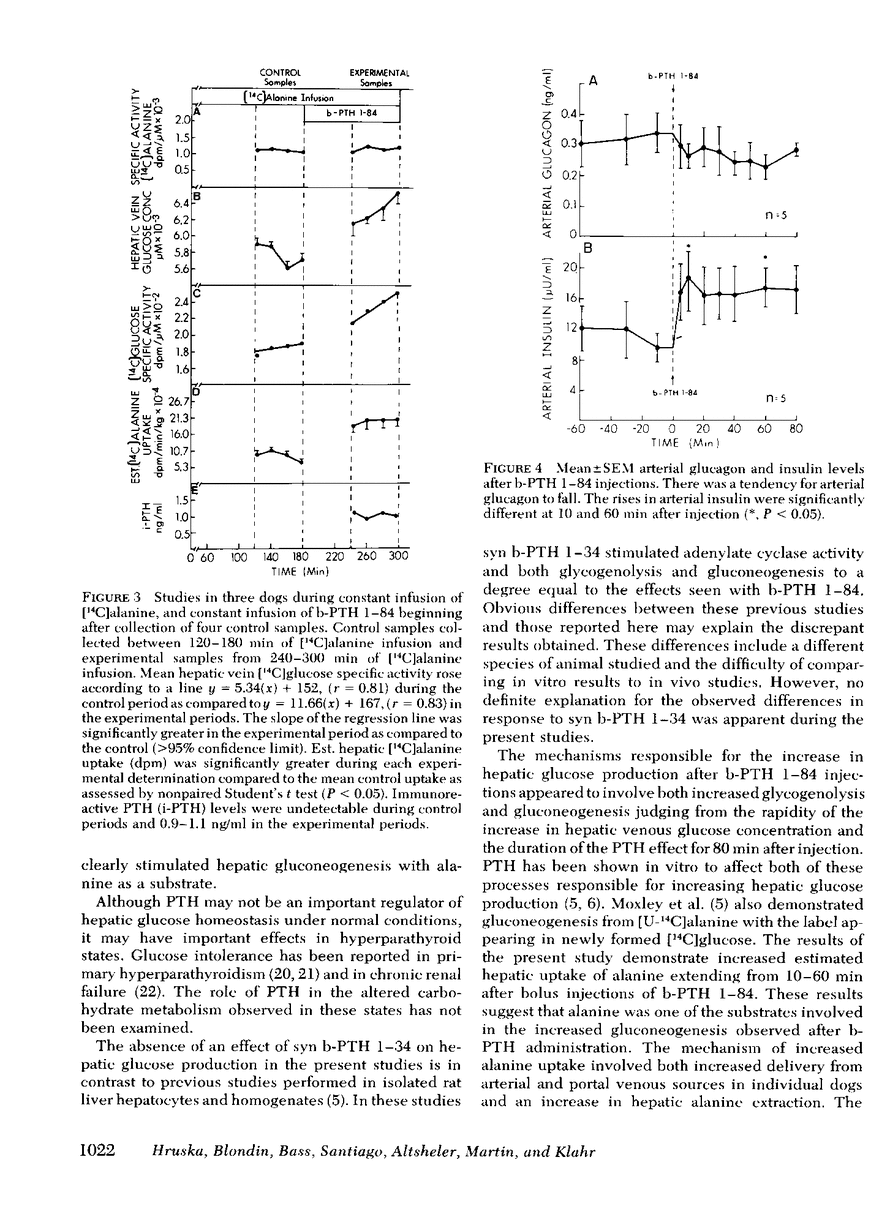 The liver has been shown to remove parathyroid hormone (PTH) from its arterial circulation by a mechanism that is selective for the intact form of the peptide (PTH 1-84). The present studies demonstrate that PTH has biologic effects on the liver in vivo. Bovine PTH 1-84 stimulated hepatic glucose release in dogs with indwelling hepatic vein catheters from basal values of 31±8 to 68±9 mg/min per kg after bolus injections of PTH. The effect on hepatic glucose release was apparent by 5 min and persisted for the 80 min of observation. The NH2-terminal PTH fragment (syn b-PTH 1-34) had no effect. Bovine PTH 1-84 administered in doses designed to produce circulating levels of immunoreactive PTH similar to the endogenous levels observed in uremic dogs also increased the incorporation of 14C from infused [14C]alanine into glucose, and increased estimated hepatic uptake of both chemical and [14C]alanine, while increasing hepatic glucose release. Thus, administration of “physiologic levels” of b-PTH 1-84 stimulated hepatic glucose release in part through increased gluconeogenesis in vivo, whereas syn b-PTH 1-34 had no demonstrable effect. Circulating levels of insulin rose after PTH administration, an increase which presumably represents a secondary response to the rise in glucose release.