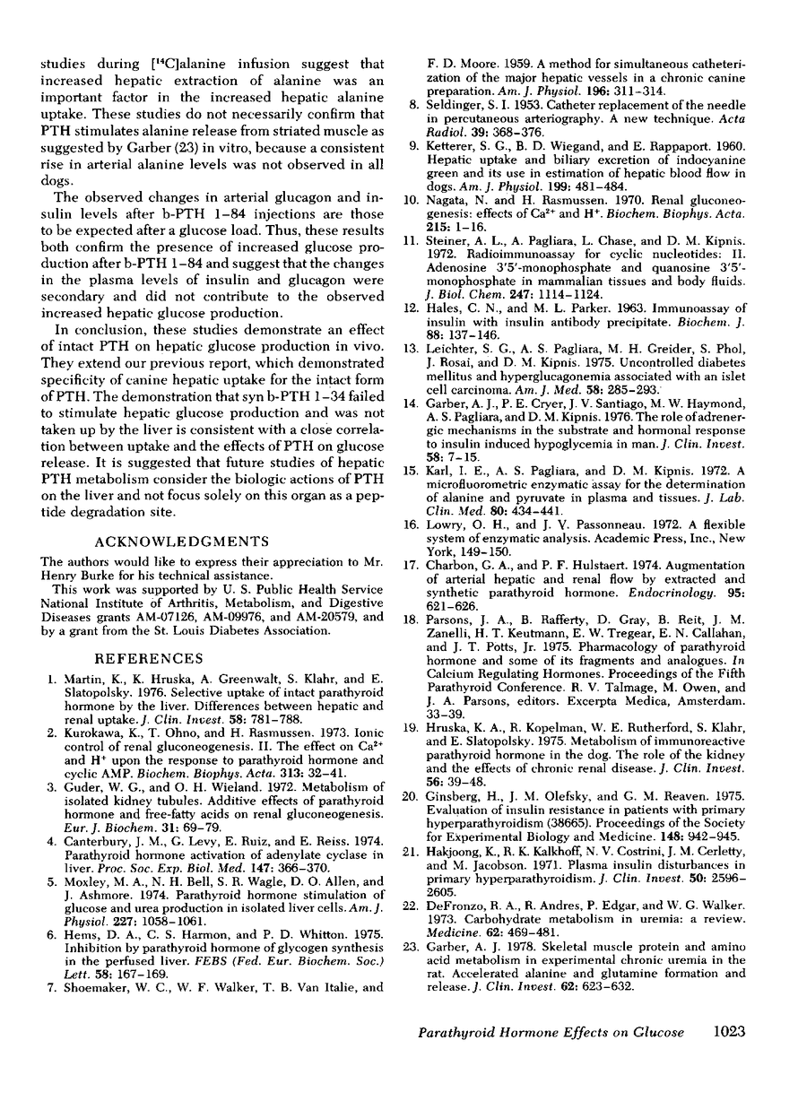 The liver has been shown to remove parathyroid hormone (PTH) from its arterial circulation by a mechanism that is selective for the intact form of the peptide (PTH 1-84). The present studies demonstrate that PTH has biologic effects on the liver in vivo. Bovine PTH 1-84 stimulated hepatic glucose release in dogs with indwelling hepatic vein catheters from basal values of 31±8 to 68±9 mg/min per kg after bolus injections of PTH. The effect on hepatic glucose release was apparent by 5 min and persisted for the 80 min of observation. The NH2-terminal PTH fragment (syn b-PTH 1-34) had no effect. Bovine PTH 1-84 administered in doses designed to produce circulating levels of immunoreactive PTH similar to the endogenous levels observed in uremic dogs also increased the incorporation of 14C from infused [14C]alanine into glucose, and increased estimated hepatic uptake of both chemical and [14C]alanine, while increasing hepatic glucose release. Thus, administration of “physiologic levels” of b-PTH 1-84 stimulated hepatic glucose release in part through increased gluconeogenesis in vivo, whereas syn b-PTH 1-34 had no demonstrable effect. Circulating levels of insulin rose after PTH administration, an increase which presumably represents a secondary response to the rise in glucose release.
