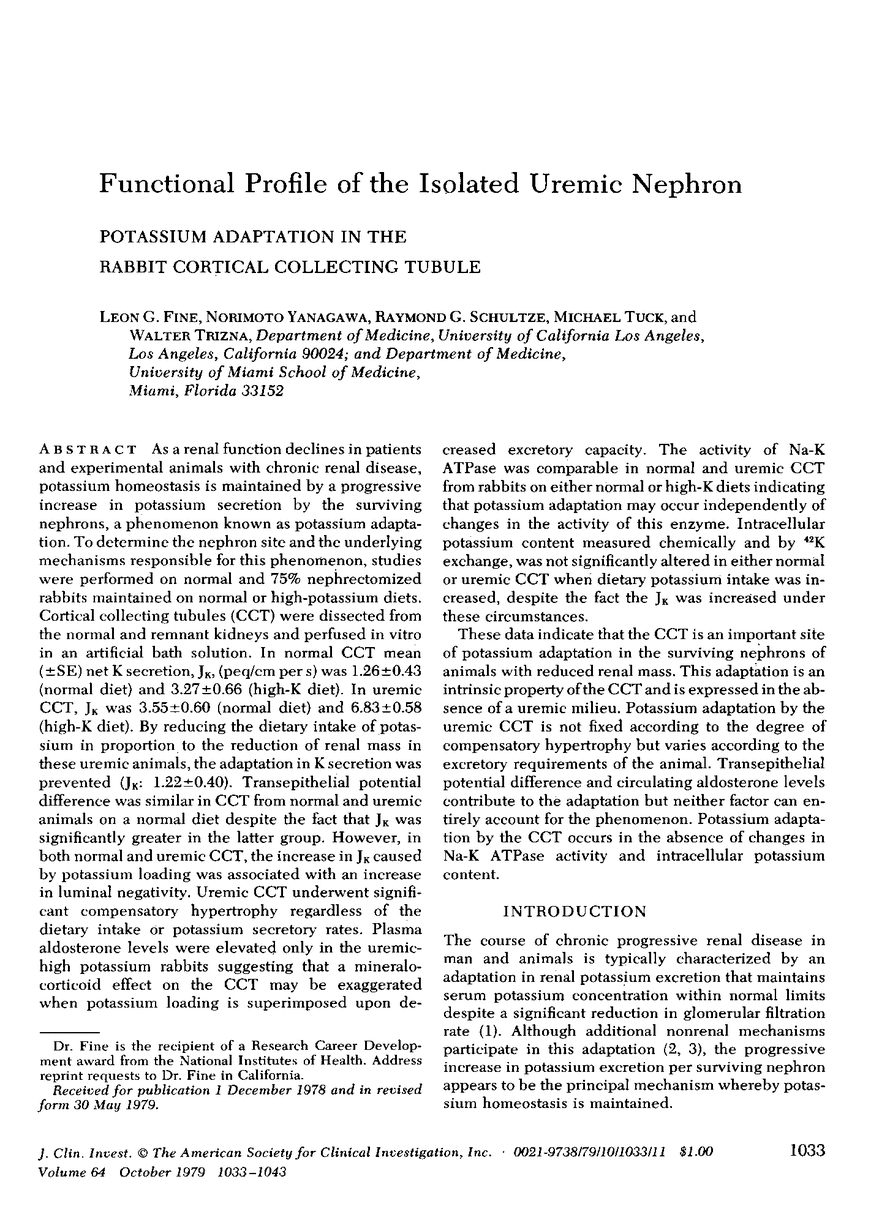 As a renal function declines in patients and experimental animals with chronic renal disease, potassium homeostasis is maintained by a progressive increase in potassium secretion by the surviving nephrons, a phenomenon known as potassium adaptation. To determine the nephron site and the underlying mechanisms responsible for this phenomenon, studies were performed on normal and 75% nephrectomized rabbits maintained on normal or high-potassium diets. Cortical collecting tubules (CCT) were dissected from the normal and remnant kidneys and perfused in vitro in an artificial solution. In normal CCT mean (+/- SE) net K secretion, JK, (peq/cm per s) was 1.26 +/- 0.43 (normal diet) and 3.27 +/- 0.66 (high-K diet). In uremic CCT, JK was 3.55 +/- 0.60 (normal diet) and 6.83 +/- 0.58 (high-K diet). By reducing the dietary intake of potassium in proportion to the reduction of renal mass in these uremic animals, the adaptation in K secretion was prevented (JK: 1.22 +/- 0.40). Transepithelial potential difference was similar in CCT from normal and uremic animals on a normal diet despite the fact that JK was significantly greater in the latter group. However, in both normal and uremic CCT, the increase in JK caused by potassium loading was associated with an increase in luminal negativity. Uremic CCT underwent significant compensatory hypertrophy regardless of the dietary intake or potassium secretory rates. Plasma aldosterone levels were elevated only in the uremic-high potassium rabbits suggesting that a mineralocorticoid effect on the CCT may be exaggerated when potassium loading is superimposed upon decreased excretory capacity. The activity of Na-K ATPase was comparable in normal and uremic CCT from rabbits on either normal or high-K diets indicating that potassium adaptation may occur independently of changes in the activity of this enzyme. Intracellular potassium content measured chemically and by 42K exchange, was not significantly altered in either normal or uremic CCT when dietary potassium intake was increased, despite the fact the JK was increased under these circumstances. These data indicate that the CCT is an important site of potassium adaptation in the surviving nephrons of animals with reduced renal mass. This adaptation is an intrinsic property of the CCT and is expressed in the absence of a uremic milieu. Potassium adaptation by the uremic CCT is not fixed according to the degree of compensatory hypertrophy but varies according to the excretory requirements of the animal. Transepithelial potential difference and circulating aldosterone levels contribute to the adaptation but neither factor can entirely account for the phenomenon. Potassium adaptation by the CCT occurs in the absence of changes in Na-K ATPase activity and intracellular potassium content.