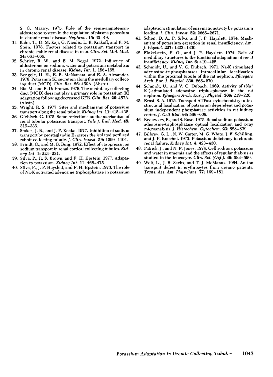 As a renal function declines in patients and experimental animals with chronic renal disease, potassium homeostasis is maintained by a progressive increase in potassium secretion by the surviving nephrons, a phenomenon known as potassium adaptation. To determine the nephron site and the underlying mechanisms responsible for this phenomenon, studies were performed on normal and 75% nephrectomized rabbits maintained on normal or high-potassium diets. Cortical collecting tubules (CCT) were dissected from the normal and remnant kidneys and perfused in vitro in an artificial solution. In normal CCT mean (+/- SE) net K secretion, JK, (peq/cm per s) was 1.26 +/- 0.43 (normal diet) and 3.27 +/- 0.66 (high-K diet). In uremic CCT, JK was 3.55 +/- 0.60 (normal diet) and 6.83 +/- 0.58 (high-K diet). By reducing the dietary intake of potassium in proportion to the reduction of renal mass in these uremic animals, the adaptation in K secretion was prevented (JK: 1.22 +/- 0.40). Transepithelial potential difference was similar in CCT from normal and uremic animals on a normal diet despite the fact that JK was significantly greater in the latter group. However, in both normal and uremic CCT, the increase in JK caused by potassium loading was associated with an increase in luminal negativity. Uremic CCT underwent significant compensatory hypertrophy regardless of the dietary intake or potassium secretory rates. Plasma aldosterone levels were elevated only in the uremic-high potassium rabbits suggesting that a mineralocorticoid effect on the CCT may be exaggerated when potassium loading is superimposed upon decreased excretory capacity. The activity of Na-K ATPase was comparable in normal and uremic CCT from rabbits on either normal or high-K diets indicating that potassium adaptation may occur independently of changes in the activity of this enzyme. Intracellular potassium content measured chemically and by 42K exchange, was not significantly altered in either normal or uremic CCT when dietary potassium intake was increased, despite the fact the JK was increased under these circumstances. These data indicate that the CCT is an important site of potassium adaptation in the surviving nephrons of animals with reduced renal mass. This adaptation is an intrinsic property of the CCT and is expressed in the absence of a uremic milieu. Potassium adaptation by the uremic CCT is not fixed according to the degree of compensatory hypertrophy but varies according to the excretory requirements of the animal. Transepithelial potential difference and circulating aldosterone levels contribute to the adaptation but neither factor can entirely account for the phenomenon. Potassium adaptation by the CCT occurs in the absence of changes in Na-K ATPase activity and intracellular potassium content.