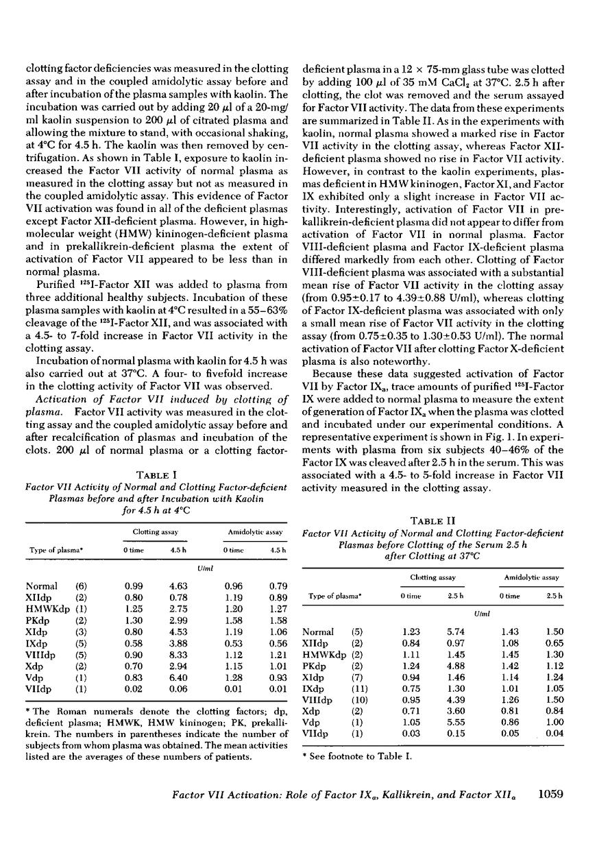 Factor VII can be activated, to a molecule giving shorter clotting times with tissue factor, by incubating plasma with kaolin or by clotting plasma. The mechanisms of activation differ. With kaolin, activated Factor XII (XIIa) was the apparent principal activator. Thus, Factor VII was not activated in Factor XII-deficient plasma, was partially activated in prekallikrein and high-molecular weight kininogen (HMW kininogen)-deficient plasmas, but was activated in other deficient plasmas. After clotting, activated Factor IX (IXa) was the apparent principal activator. Thus, Factor VII was not activated in Factor XII-,HMW kininogen-, XI-, and IX-deficient plasmas, but was activated in Factor VIII-, X-, and V-deficient plasmas. In further studies, purified small-fragment Factor XIIa (β-XIIa), kallikrein, and Factor IXa were added to partially purified Factor VII and to plasma. High concentrations of β-XIIa activated Factor VII in a purified system; much lower concentrations of β-XIIa activated Factor VII in normal plasma but not in prekallikrein or HWM kininogen-deficient plasmas. Kallikrein alone failed to activate partially purified Factor VII but did so when purified Factor IX was added. Kallikrein also activated Factor VII in normal, Factor XII-, and Factor IX-deficient plasmas. Purified Factor IXa activated partially purified Factor VII and had no additional indirect activating effect in the presence of plasma. These results demonstrate that both Factor XIIa and Factor IXa directly activate human Factor VII, whereas kallikrein, through generation of Factor XIIa and Factor IXa, functions as an indirect activator of Factor VII.