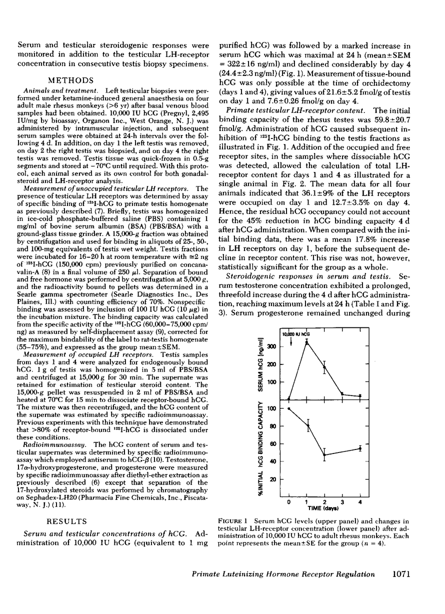 The testicular luteinizing hormone (LH) receptors of the rhesus monkey and human have many features in common, including high equilibrium association constant, marked species specificity, and relatively low binding capacity. We have, therefore, used rhesus monkeys as models for human LH-receptor regulation in vivo during gonadotropin treatment. In four adult male monkeys, treated with 10,000 IU human chorionic gonadotropin (hCG), serum and testicular steroidogenic responses were monitored at 24-h intervals during the following 4 d, and LH-receptor concentrations were measured by 125I-hCG binding to 15,000-g particles prepared from testis biopsy specimens. In treated animals, serum hCG was maximal on day 1 at 322±16 ng/ml and declined to 24.4±2.3 ng/ml by day 4. Serum testosterone was increased threefold during the subsequent 4 d (from 6.5±2.0 to 18.6±4.4 ng/ml) but serum progesterone remained unchanged. In contrast, serum 17α-hydroxyprogesterone increased 12-fold to 5.5±0.5 ng/ml at day 1 and was increased fourfold during the subsequent 3 d. The LH-receptor binding capacity of the primate testis was reduced by 18.3±6.0% on day 1, 51.7±7.4% on day 2, and 45.3±2.4% on day 4. Occupancy of the LH receptors by endogenously bound hCG was significant on day 1 but was negligible by day 4. These data demonstrate that gonadotropin-induced LH-receptor depletion occurs in the rhesus testis and indicate that primate gonadotropin receptors are susceptible to the regulatory processes recently described in the rat. In addition, the simultaneous and disproportionate accumulation of 17α-hydroxyprogesterone indicates that 17,20-desmolase was rate-limiting under these conditions in the primate testis Leydig cell.