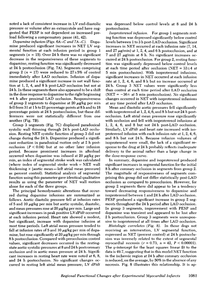 Characterization of the temporal evolution of resting segmental function and inotropic reserve after coronary occlusion may be important in evaluating attempts to salvage ischemic but non-necrotic myocardium. Accordingly, we chronically implanted up to six pairs of pulse-transit piezoelectric crystals in the left ventricular myocardium of dogs to measure segmental wall thickness. Segments were separated into groups according to the loss of net systolic thickening (NET) at 5 min postocclusion of the left anterior descending coronary artery in awake, unsedated dogs. Group 1 included segments with NET values of 67--100+ (percent control); group 2 between 67 and 0; and group 3 less than 0 (paradoxical motion). 5 min after coronary occlusion, group 1 NET was 92 +/- 5% (SEM) although significant decreases occurred in NET in group 2 (36 +/- 4%) and group 3 segments (-33 +/- 5%). Between 5 min and 24 h after coronary occlusion, no further significant changes occurred in NET in groups 1, 2, and 3 crystals. Some segments underwent further functional deterioration between 24 h and 1 wk after left anterior descending coronary artery occlusion, although no overall change occurred in segments with mild to moderate ischemic dysfunction. Segments with NET less than 0 at 24 h, on the other hand, exhibited a reduction in aneurysmal bulging between 24 h and 1 wk from -41 +/- 10 to -23 +/- 11% (n = 12, P = 0.02). Inotropic reserve was assessed with postextrasystolic potentiation (PESP) in 14 dogs, and with infusions of dopamine (11 dogs), and isoproterenol (13 dogs). PESP was the most potent intervention and produced a significant augmentation in NET in group 2 crystals at 1, 2, 4, 6,8, and 24 h after coronary occlusion but only at 1 and 2 h in NET in group 3 crystals. Thus, following experimental coronary occlusion, the evolution of ischemic segmental dysfunction is dynamic and variable. A significant degree of inotropic reserve, as assessed by PESP, dopamine, and isoproterenol, exists in segments with moderate ischemic dysfunction for 24 h but for only 2 h after coronary occlusion in those segments with the most severe ischemic dysfunction. In addition, at least some segmental sites with mild to moderate ischemic dysfunction at 24 h deteriorate further between 24 h and 1 wk after experimental coronary occlusion.