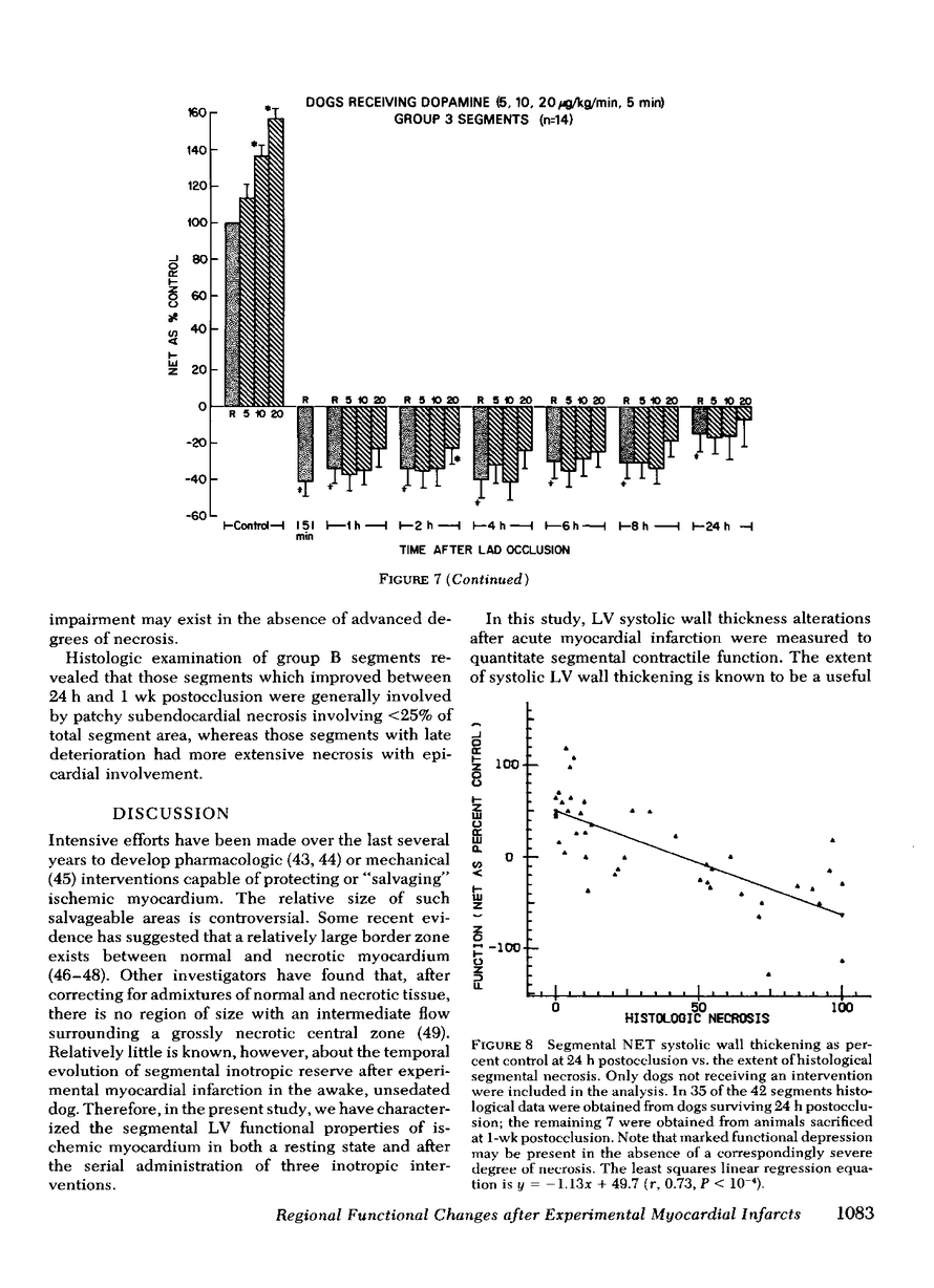 Characterization of the temporal evolution of resting segmental function and inotropic reserve after coronary occlusion may be important in evaluating attempts to salvage ischemic but non-necrotic myocardium. Accordingly, we chronically implanted up to six pairs of pulse-transit piezoelectric crystals in the left ventricular myocardium of dogs to measure segmental wall thickness. Segments were separated into groups according to the loss of net systolic thickening (NET) at 5 min postocclusion of the left anterior descending coronary artery in awake, unsedated dogs. Group 1 included segments with NET values of 67--100+ (percent control); group 2 between 67 and 0; and group 3 less than 0 (paradoxical motion). 5 min after coronary occlusion, group 1 NET was 92 +/- 5% (SEM) although significant decreases occurred in NET in group 2 (36 +/- 4%) and group 3 segments (-33 +/- 5%). Between 5 min and 24 h after coronary occlusion, no further significant changes occurred in NET in groups 1, 2, and 3 crystals. Some segments underwent further functional deterioration between 24 h and 1 wk after left anterior descending coronary artery occlusion, although no overall change occurred in segments with mild to moderate ischemic dysfunction. Segments with NET less than 0 at 24 h, on the other hand, exhibited a reduction in aneurysmal bulging between 24 h and 1 wk from -41 +/- 10 to -23 +/- 11% (n = 12, P = 0.02). Inotropic reserve was assessed with postextrasystolic potentiation (PESP) in 14 dogs, and with infusions of dopamine (11 dogs), and isoproterenol (13 dogs). PESP was the most potent intervention and produced a significant augmentation in NET in group 2 crystals at 1, 2, 4, 6,8, and 24 h after coronary occlusion but only at 1 and 2 h in NET in group 3 crystals. Thus, following experimental coronary occlusion, the evolution of ischemic segmental dysfunction is dynamic and variable. A significant degree of inotropic reserve, as assessed by PESP, dopamine, and isoproterenol, exists in segments with moderate ischemic dysfunction for 24 h but for only 2 h after coronary occlusion in those segments with the most severe ischemic dysfunction. In addition, at least some segmental sites with mild to moderate ischemic dysfunction at 24 h deteriorate further between 24 h and 1 wk after experimental coronary occlusion.