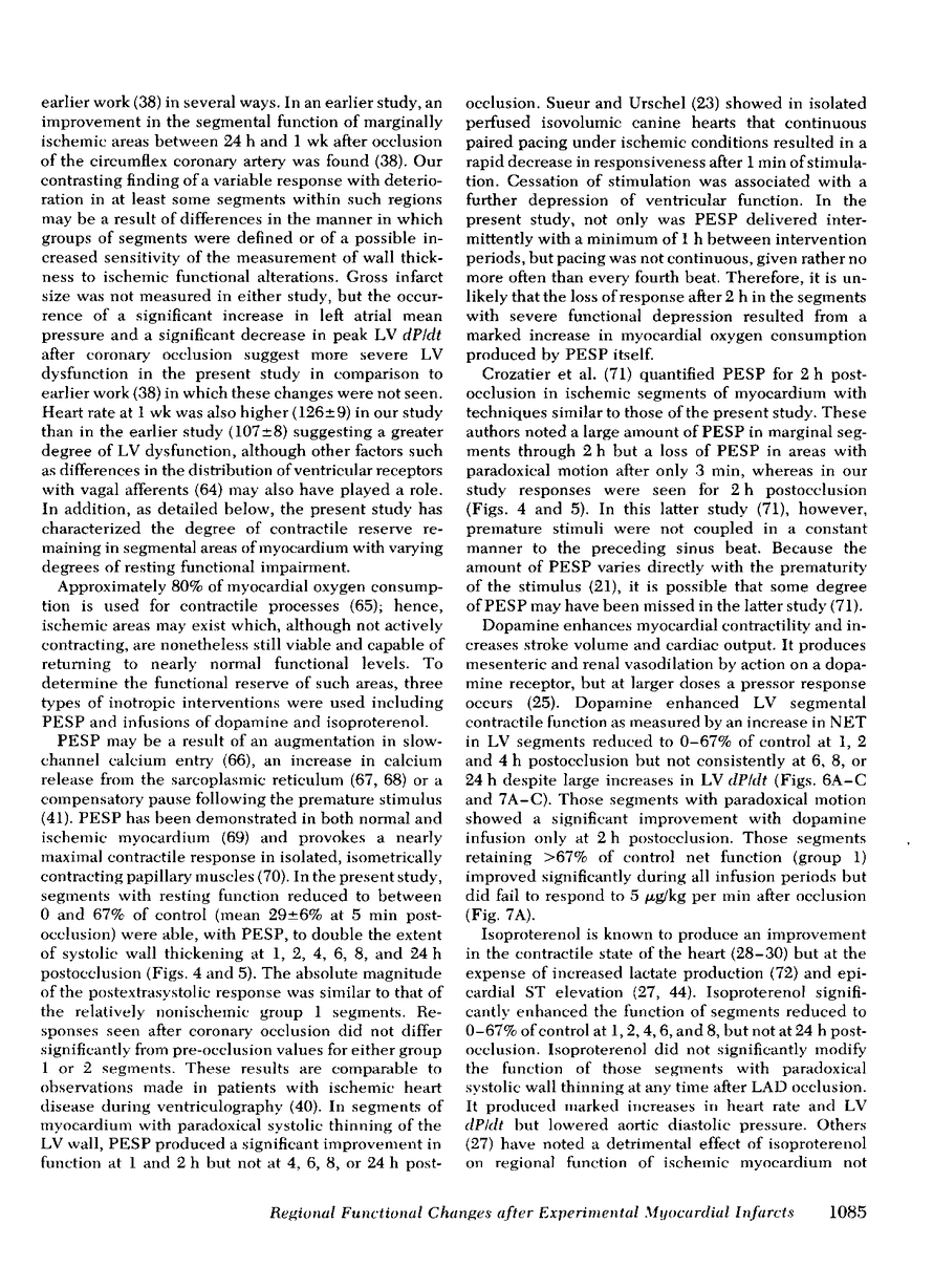 Characterization of the temporal evolution of resting segmental function and inotropic reserve after coronary occlusion may be important in evaluating attempts to salvage ischemic but non-necrotic myocardium. Accordingly, we chronically implanted up to six pairs of pulse-transit piezoelectric crystals in the left ventricular myocardium of dogs to measure segmental wall thickness. Segments were separated into groups according to the loss of net systolic thickening (NET) at 5 min postocclusion of the left anterior descending coronary artery in awake, unsedated dogs. Group 1 included segments with NET values of 67--100+ (percent control); group 2 between 67 and 0; and group 3 less than 0 (paradoxical motion). 5 min after coronary occlusion, group 1 NET was 92 +/- 5% (SEM) although significant decreases occurred in NET in group 2 (36 +/- 4%) and group 3 segments (-33 +/- 5%). Between 5 min and 24 h after coronary occlusion, no further significant changes occurred in NET in groups 1, 2, and 3 crystals. Some segments underwent further functional deterioration between 24 h and 1 wk after left anterior descending coronary artery occlusion, although no overall change occurred in segments with mild to moderate ischemic dysfunction. Segments with NET less than 0 at 24 h, on the other hand, exhibited a reduction in aneurysmal bulging between 24 h and 1 wk from -41 +/- 10 to -23 +/- 11% (n = 12, P = 0.02). Inotropic reserve was assessed with postextrasystolic potentiation (PESP) in 14 dogs, and with infusions of dopamine (11 dogs), and isoproterenol (13 dogs). PESP was the most potent intervention and produced a significant augmentation in NET in group 2 crystals at 1, 2, 4, 6,8, and 24 h after coronary occlusion but only at 1 and 2 h in NET in group 3 crystals. Thus, following experimental coronary occlusion, the evolution of ischemic segmental dysfunction is dynamic and variable. A significant degree of inotropic reserve, as assessed by PESP, dopamine, and isoproterenol, exists in segments with moderate ischemic dysfunction for 24 h but for only 2 h after coronary occlusion in those segments with the most severe ischemic dysfunction. In addition, at least some segmental sites with mild to moderate ischemic dysfunction at 24 h deteriorate further between 24 h and 1 wk after experimental coronary occlusion.