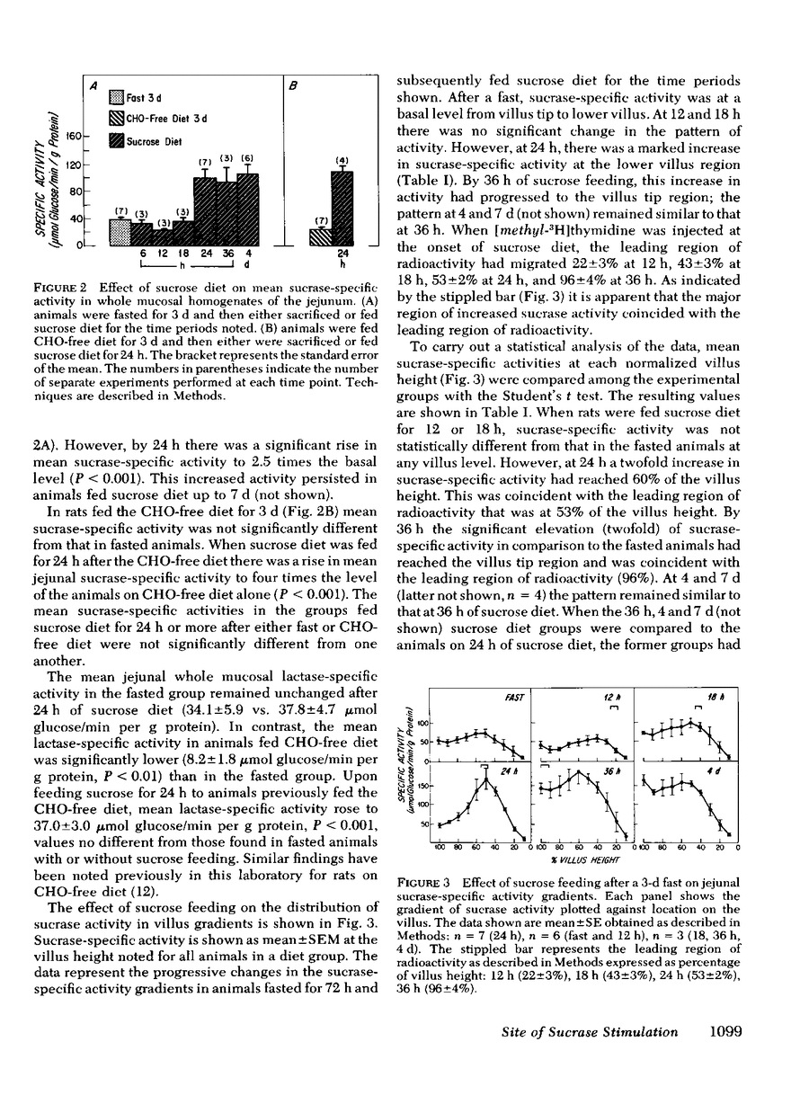 To identify the site of stimulation of sucrase by a sucrose diet, changes in sucrase-specific activity of jejunal mucosa were studied after introduction of sucrose diet to carbohydrate-deprived rats. Results were correlated with simultaneous changes in villus gradients of sucrase-specific activity. Simultaneous with the introduction of sucrose diet, [3H]thymidine (100 μCi) was administered intravenously, and rates of cell migration measured during adaptation to the new diet. After a 72-h fast, rats fed sucrose diet for 6, 12, or 18 h showed no change in sucrase-specific activity in either whole mucosa or villus gradients. However, within 18-24 h after starting a sucrose diet, there was a marked rise in whole mucosal sucrase-specific activity above fasting values (99 ± 14 vs. 38 ± 4 μM glucose/min per g protein, P < 0.001) in association with the development of a region of increased activity at the lower villus (154 ± 22 vs. 60 ± 9 μM glucose/min per g protein, P < 0.02, but with no change in villus tip activity (56 ± 5 vs. 46 ± 8 μM glucose/min per g protein). Similar changes were seen in animals fed 24 h of sucrose diet after a 72-h carbohydratefree diet. Fasted animals fed sucrose diet for 36 h had increased sucrase-specific activity at the villus tip (144 ± 11 μM glucose/min per g protein) as well as at the lower villus region, and this pattern persisted at 1 wk of sucrose diet. Maximal activity patterns for isomaltase and maltase paralleled those for sucrase, but the villus gradients for lactase were unaffected by sucrose diet. The region of maximal sucrase-specific activity always coincided with or followed the leading edge of radioactivity as determined by liquid scintillation counting. Therefore, sucrose-mediated changes in sucrase activity of the jejunal mucosa in the rat appear to be initiated at the level of the crypt epithelial cell and are expressed after a latent period of 18-24 h during which these cells mature and migrate toward the villus tip.