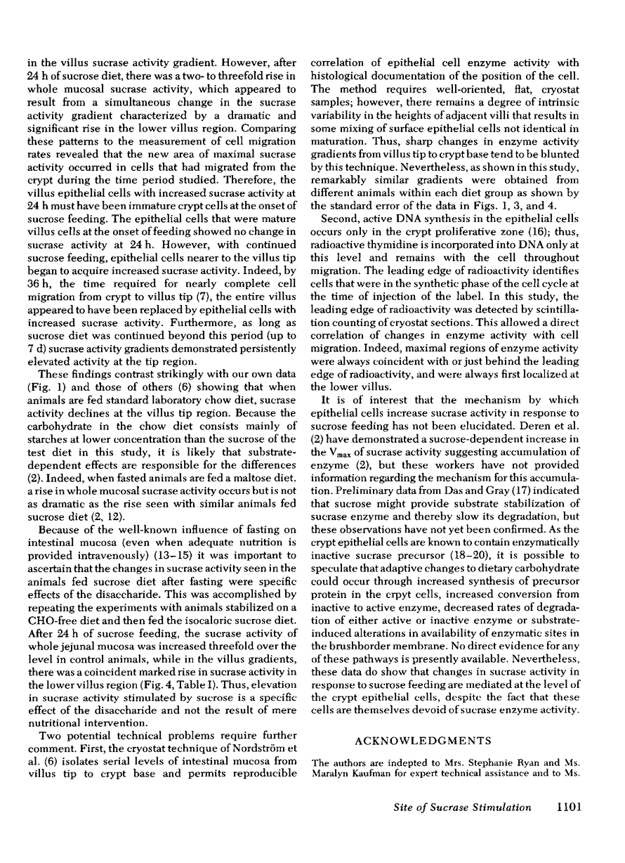 To identify the site of stimulation of sucrase by a sucrose diet, changes in sucrase-specific activity of jejunal mucosa were studied after introduction of sucrose diet to carbohydrate-deprived rats. Results were correlated with simultaneous changes in villus gradients of sucrase-specific activity. Simultaneous with the introduction of sucrose diet, [3H]thymidine (100 μCi) was administered intravenously, and rates of cell migration measured during adaptation to the new diet. After a 72-h fast, rats fed sucrose diet for 6, 12, or 18 h showed no change in sucrase-specific activity in either whole mucosa or villus gradients. However, within 18-24 h after starting a sucrose diet, there was a marked rise in whole mucosal sucrase-specific activity above fasting values (99 ± 14 vs. 38 ± 4 μM glucose/min per g protein, P < 0.001) in association with the development of a region of increased activity at the lower villus (154 ± 22 vs. 60 ± 9 μM glucose/min per g protein, P < 0.02, but with no change in villus tip activity (56 ± 5 vs. 46 ± 8 μM glucose/min per g protein). Similar changes were seen in animals fed 24 h of sucrose diet after a 72-h carbohydratefree diet. Fasted animals fed sucrose diet for 36 h had increased sucrase-specific activity at the villus tip (144 ± 11 μM glucose/min per g protein) as well as at the lower villus region, and this pattern persisted at 1 wk of sucrose diet. Maximal activity patterns for isomaltase and maltase paralleled those for sucrase, but the villus gradients for lactase were unaffected by sucrose diet. The region of maximal sucrase-specific activity always coincided with or followed the leading edge of radioactivity as determined by liquid scintillation counting. Therefore, sucrose-mediated changes in sucrase activity of the jejunal mucosa in the rat appear to be initiated at the level of the crypt epithelial cell and are expressed after a latent period of 18-24 h during which these cells mature and migrate toward the villus tip.