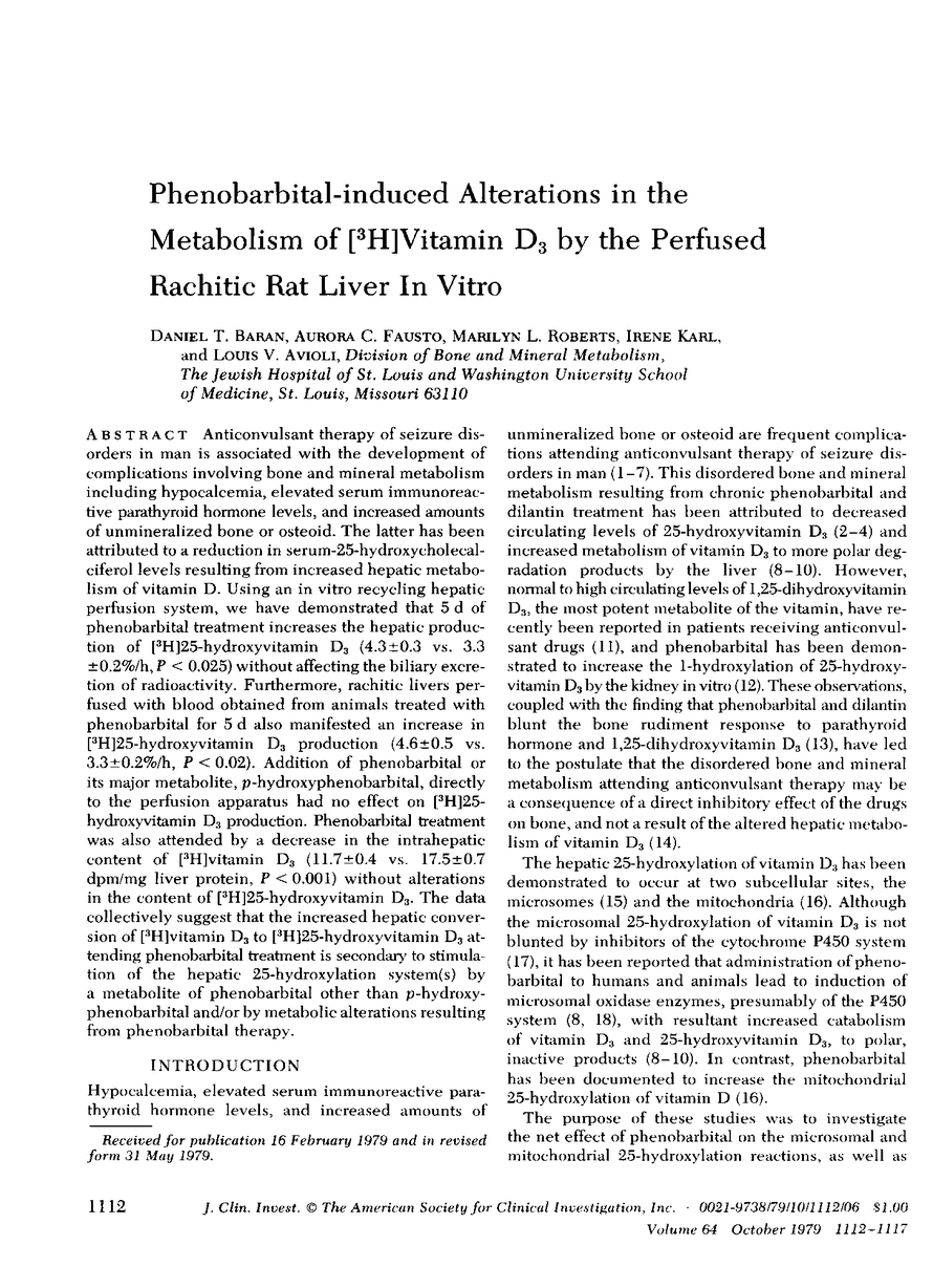 Anticonvulsant therapy of seizure disorders in man is associated with the development of complications involving bone and mineral metabolism including hypocalcemia, elevated serum immunoreactive parathyroid hormone levels, and increased amounts of unmineralized bone or osteoid. The latter has been attributed to a reduction in serum-25-hydroxycholecalciferol levels resulting from increased hepatic metabolism of vitamin D. Using an in vitro recycling hepatic perfusion system, we have demonstrated that 5 d of phenobarbital treatment increases the hepatic production of [3H]25-hydroxyvitamin D3 (4.3±0.3 vs. 3.3±0.2%/h, P <0.025) without affecting the biliary excretion of radioactivity. Furthermore, rachitic livers perfused with blood obtained from animals treated with phenobarbital for 5 d also manifested an increase in [3H]25-hydroxyvitamin D3 production (4.6±0.5 vs. 3.3±0.2%/h, P < 0.02). Addition of phenobarbital or its major metabolite, p-hydroxyphenobarbital, directly to the perfusion apparatus had no effect on [3H]25-hydroxyvitamin D3 production. Phenobarbital treatment was also attended by a decrease in the intrahepatic content of [3H]vitamin D3 (11.7±0.4 vs. 17.5±0.7 dpm/mg liver protein, P < 0.001) without alterations in the content of [3H]25-hydroxyvitamin D3. The data collectively suggest that the increased hepatic conversion of [3H]vitamin D3 to [3H]25-hydroxyvitamin D3 attending phenobarbital treatment is secondary to stimulation of the hepatic 25-hydroxylation system(s) by a metabolite of phenobarbital other than p-hydroxyphenobarbital and/or by metabolic alterations resulting from phenobarbital therapy.