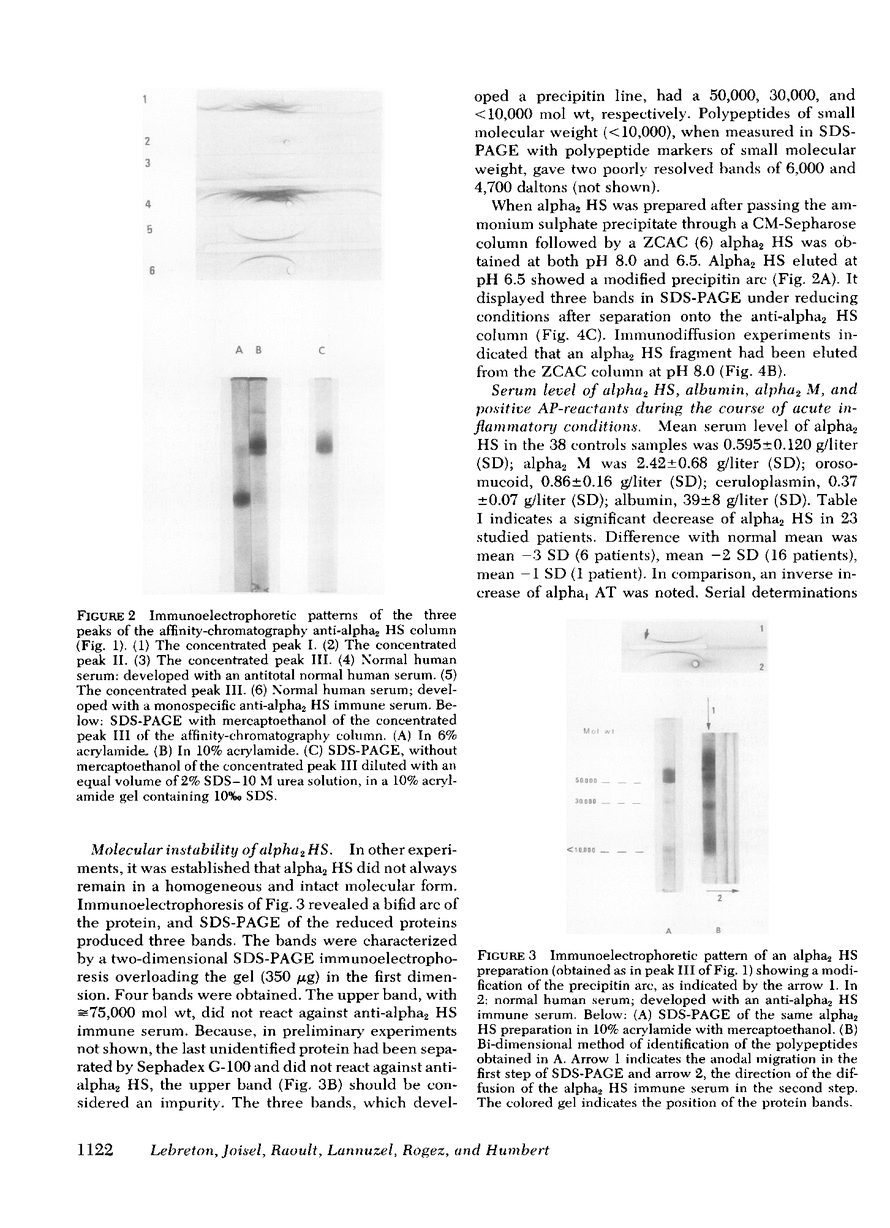 A nonspecific opsonin function has been ascribed to human alpha 2 HS glycoprotein. Its serum level has been shown to be decreased in trauma patients. Recent studies from this laboratory revealed a heterogeneity among the products obtained in the course of the preparation of the protein. To date, no definitive agreement existed with regard to a molecular homogeneous entity of alpha 2 HS glycoprotein (Ba-alpha 2 glycoproteins). The purpose of the current work was to study the variations in serum level of alpha 2 HS in patients suffering from an acute inflammatory process of bacterial etiology and to determine whether a decrease in alpha 2 HS was accompanied by the appearance of fragments of this protein in the serum. A method of preparing alpha 2 HS was thus developed, using an immune absorbent as a final purification step. In an intermediary step of the preparation, alpha 2 HS was found to bind zinc when metal chelate affinity chromatography was employed. Immunologically and physico-chemically pure alpha 2 HS was obtained. The protein consists of a unique polypeptide chain of about 50,000 daltons and has a unique amino-terminal residue, alanine. However, the protein maintained its molecular integrity with difficulty, and spontaneous fragments ranging from 30,000 to less than 10,000 daltons were produced in some of the preparations. No major modification in the molecular structure of the protein was noted in the sera of subjects suffering from an acute inflammatory process. Serum level of alpha 2 HS and alpha 1 antitrypsin (AT)was determined in 23 patients. When the acute-phase (AP-)reactant alpha 1 AT was increased (difference with normal mean greater than +2 or +3 SD), the sera showed a large decrease in alpha 2 HS (difference with normal mean less than -2 or -3 SD). The serum level of alpha 2 HS, albumin, alpha 2 macroglobulin, and of positive AP-reactants, orosomucoidinal study of seven patients. The results were submitted to a principal components analysis. Alpha 2 HS showed a negative correlation with the AP-reactants alpha 1 AT, orosomucoid, and haptoglobin (P less than 0.05) and a positive correlation with albumin (P less than 0.05); these findings indicate that alpha 2 HS is a negative AP-reactant. In addition, analysis of the principal components confirms thestrong analogy between alpha 2 HS and albumin and indicates that serum level behavior of the AP-reactants during the course of the disease closely depends on the protein studied.