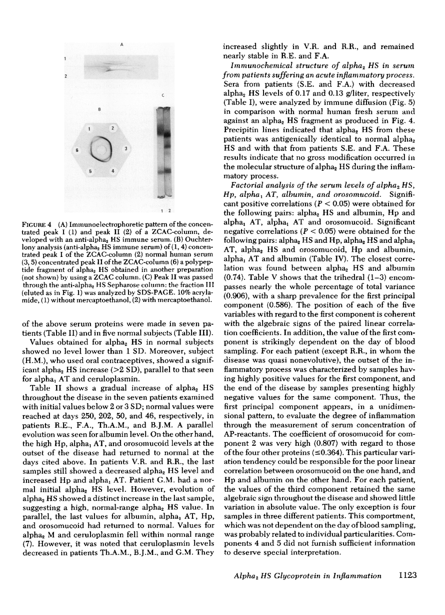 A nonspecific opsonin function has been ascribed to human alpha 2 HS glycoprotein. Its serum level has been shown to be decreased in trauma patients. Recent studies from this laboratory revealed a heterogeneity among the products obtained in the course of the preparation of the protein. To date, no definitive agreement existed with regard to a molecular homogeneous entity of alpha 2 HS glycoprotein (Ba-alpha 2 glycoproteins). The purpose of the current work was to study the variations in serum level of alpha 2 HS in patients suffering from an acute inflammatory process of bacterial etiology and to determine whether a decrease in alpha 2 HS was accompanied by the appearance of fragments of this protein in the serum. A method of preparing alpha 2 HS was thus developed, using an immune absorbent as a final purification step. In an intermediary step of the preparation, alpha 2 HS was found to bind zinc when metal chelate affinity chromatography was employed. Immunologically and physico-chemically pure alpha 2 HS was obtained. The protein consists of a unique polypeptide chain of about 50,000 daltons and has a unique amino-terminal residue, alanine. However, the protein maintained its molecular integrity with difficulty, and spontaneous fragments ranging from 30,000 to less than 10,000 daltons were produced in some of the preparations. No major modification in the molecular structure of the protein was noted in the sera of subjects suffering from an acute inflammatory process. Serum level of alpha 2 HS and alpha 1 antitrypsin (AT)was determined in 23 patients. When the acute-phase (AP-)reactant alpha 1 AT was increased (difference with normal mean greater than +2 or +3 SD), the sera showed a large decrease in alpha 2 HS (difference with normal mean less than -2 or -3 SD). The serum level of alpha 2 HS, albumin, alpha 2 macroglobulin, and of positive AP-reactants, orosomucoidinal study of seven patients. The results were submitted to a principal components analysis. Alpha 2 HS showed a negative correlation with the AP-reactants alpha 1 AT, orosomucoid, and haptoglobin (P less than 0.05) and a positive correlation with albumin (P less than 0.05); these findings indicate that alpha 2 HS is a negative AP-reactant. In addition, analysis of the principal components confirms thestrong analogy between alpha 2 HS and albumin and indicates that serum level behavior of the AP-reactants during the course of the disease closely depends on the protein studied.