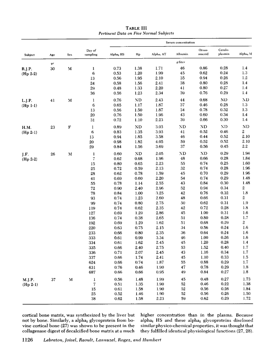 A nonspecific opsonin function has been ascribed to human alpha 2 HS glycoprotein. Its serum level has been shown to be decreased in trauma patients. Recent studies from this laboratory revealed a heterogeneity among the products obtained in the course of the preparation of the protein. To date, no definitive agreement existed with regard to a molecular homogeneous entity of alpha 2 HS glycoprotein (Ba-alpha 2 glycoproteins). The purpose of the current work was to study the variations in serum level of alpha 2 HS in patients suffering from an acute inflammatory process of bacterial etiology and to determine whether a decrease in alpha 2 HS was accompanied by the appearance of fragments of this protein in the serum. A method of preparing alpha 2 HS was thus developed, using an immune absorbent as a final purification step. In an intermediary step of the preparation, alpha 2 HS was found to bind zinc when metal chelate affinity chromatography was employed. Immunologically and physico-chemically pure alpha 2 HS was obtained. The protein consists of a unique polypeptide chain of about 50,000 daltons and has a unique amino-terminal residue, alanine. However, the protein maintained its molecular integrity with difficulty, and spontaneous fragments ranging from 30,000 to less than 10,000 daltons were produced in some of the preparations. No major modification in the molecular structure of the protein was noted in the sera of subjects suffering from an acute inflammatory process. Serum level of alpha 2 HS and alpha 1 antitrypsin (AT)was determined in 23 patients. When the acute-phase (AP-)reactant alpha 1 AT was increased (difference with normal mean greater than +2 or +3 SD), the sera showed a large decrease in alpha 2 HS (difference with normal mean less than -2 or -3 SD). The serum level of alpha 2 HS, albumin, alpha 2 macroglobulin, and of positive AP-reactants, orosomucoidinal study of seven patients. The results were submitted to a principal components analysis. Alpha 2 HS showed a negative correlation with the AP-reactants alpha 1 AT, orosomucoid, and haptoglobin (P less than 0.05) and a positive correlation with albumin (P less than 0.05); these findings indicate that alpha 2 HS is a negative AP-reactant. In addition, analysis of the principal components confirms thestrong analogy between alpha 2 HS and albumin and indicates that serum level behavior of the AP-reactants during the course of the disease closely depends on the protein studied.