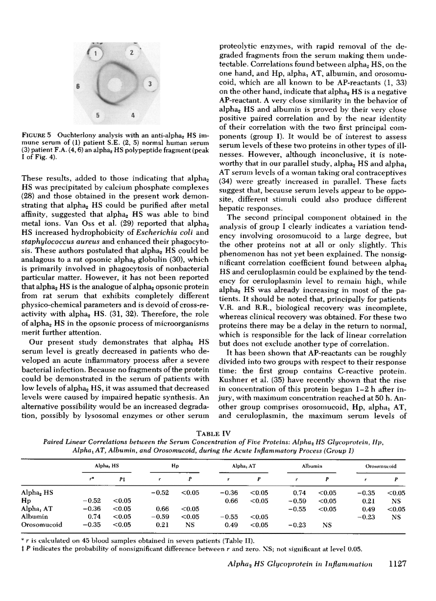 A nonspecific opsonin function has been ascribed to human alpha 2 HS glycoprotein. Its serum level has been shown to be decreased in trauma patients. Recent studies from this laboratory revealed a heterogeneity among the products obtained in the course of the preparation of the protein. To date, no definitive agreement existed with regard to a molecular homogeneous entity of alpha 2 HS glycoprotein (Ba-alpha 2 glycoproteins). The purpose of the current work was to study the variations in serum level of alpha 2 HS in patients suffering from an acute inflammatory process of bacterial etiology and to determine whether a decrease in alpha 2 HS was accompanied by the appearance of fragments of this protein in the serum. A method of preparing alpha 2 HS was thus developed, using an immune absorbent as a final purification step. In an intermediary step of the preparation, alpha 2 HS was found to bind zinc when metal chelate affinity chromatography was employed. Immunologically and physico-chemically pure alpha 2 HS was obtained. The protein consists of a unique polypeptide chain of about 50,000 daltons and has a unique amino-terminal residue, alanine. However, the protein maintained its molecular integrity with difficulty, and spontaneous fragments ranging from 30,000 to less than 10,000 daltons were produced in some of the preparations. No major modification in the molecular structure of the protein was noted in the sera of subjects suffering from an acute inflammatory process. Serum level of alpha 2 HS and alpha 1 antitrypsin (AT)was determined in 23 patients. When the acute-phase (AP-)reactant alpha 1 AT was increased (difference with normal mean greater than +2 or +3 SD), the sera showed a large decrease in alpha 2 HS (difference with normal mean less than -2 or -3 SD). The serum level of alpha 2 HS, albumin, alpha 2 macroglobulin, and of positive AP-reactants, orosomucoidinal study of seven patients. The results were submitted to a principal components analysis. Alpha 2 HS showed a negative correlation with the AP-reactants alpha 1 AT, orosomucoid, and haptoglobin (P less than 0.05) and a positive correlation with albumin (P less than 0.05); these findings indicate that alpha 2 HS is a negative AP-reactant. In addition, analysis of the principal components confirms thestrong analogy between alpha 2 HS and albumin and indicates that serum level behavior of the AP-reactants during the course of the disease closely depends on the protein studied.