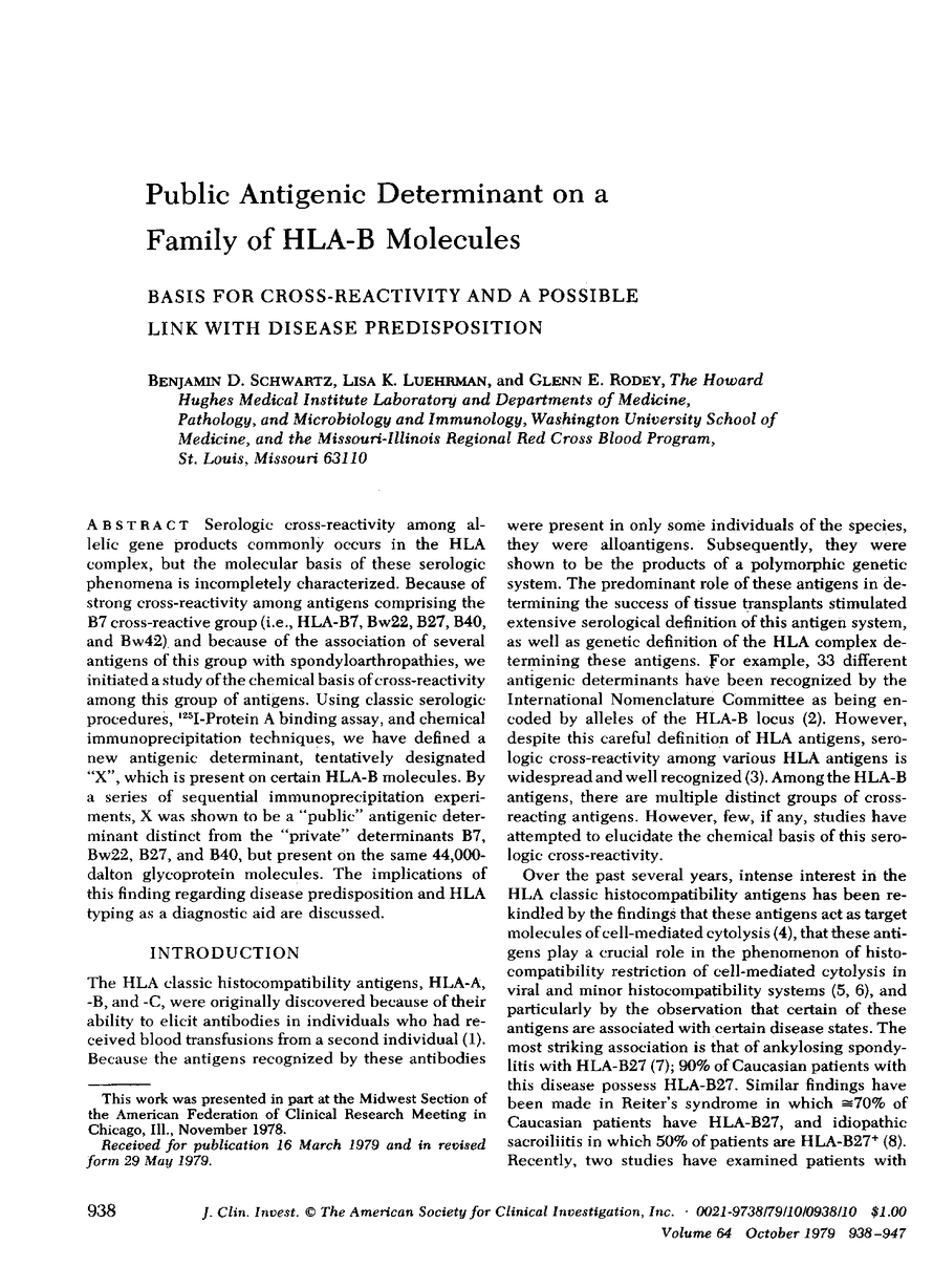 Serologic cross-reactivity among allelic gene products commonly occurs in the HLA complex, but the molecular basis of these serologic phenomena is incompletely characterized. Because of strong cross-reactivity among antigens comprising the B7 cross-reactive group (i.e., HLA-B7, Bw22, B27, B40, and Bw42) and because of the association of several antigens of this group with spondyloarthropathies, we initiated a study of the chemical basis of cross-reactivity among this group of antigens. Using classic serologic procedures, 125I-Protein A binding assay, and chemical immunoprecipitation techniques, we have defined a new antigenic determinant, tentatively designated "X", which is present on certain HLA-B molecules. By a series of sequential immunoprecipitation experiments, X was shown to be a "public" antigenic determinant distinct from the "private" determinants B7, Bw22, B27, and B40, but present on the same 44,000-dalton glycoprotein molecules. The implications of this finding regarding disease predisposition and HLA typing as a diagnostic aid are discussed.