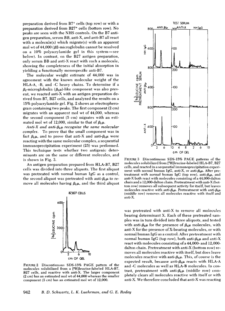 Serologic cross-reactivity among allelic gene products commonly occurs in the HLA complex, but the molecular basis of these serologic phenomena is incompletely characterized. Because of strong cross-reactivity among antigens comprising the B7 cross-reactive group (i.e., HLA-B7, Bw22, B27, B40, and Bw42) and because of the association of several antigens of this group with spondyloarthropathies, we initiated a study of the chemical basis of cross-reactivity among this group of antigens. Using classic serologic procedures, 125I-Protein A binding assay, and chemical immunoprecipitation techniques, we have defined a new antigenic determinant, tentatively designated "X", which is present on certain HLA-B molecules. By a series of sequential immunoprecipitation experiments, X was shown to be a "public" antigenic determinant distinct from the "private" determinants B7, Bw22, B27, and B40, but present on the same 44,000-dalton glycoprotein molecules. The implications of this finding regarding disease predisposition and HLA typing as a diagnostic aid are discussed.