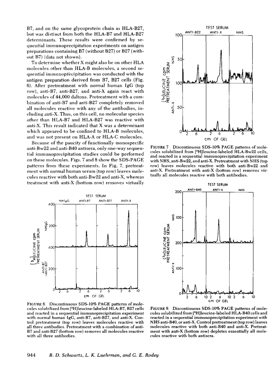 Serologic cross-reactivity among allelic gene products commonly occurs in the HLA complex, but the molecular basis of these serologic phenomena is incompletely characterized. Because of strong cross-reactivity among antigens comprising the B7 cross-reactive group (i.e., HLA-B7, Bw22, B27, B40, and Bw42) and because of the association of several antigens of this group with spondyloarthropathies, we initiated a study of the chemical basis of cross-reactivity among this group of antigens. Using classic serologic procedures, 125I-Protein A binding assay, and chemical immunoprecipitation techniques, we have defined a new antigenic determinant, tentatively designated "X", which is present on certain HLA-B molecules. By a series of sequential immunoprecipitation experiments, X was shown to be a "public" antigenic determinant distinct from the "private" determinants B7, Bw22, B27, and B40, but present on the same 44,000-dalton glycoprotein molecules. The implications of this finding regarding disease predisposition and HLA typing as a diagnostic aid are discussed.