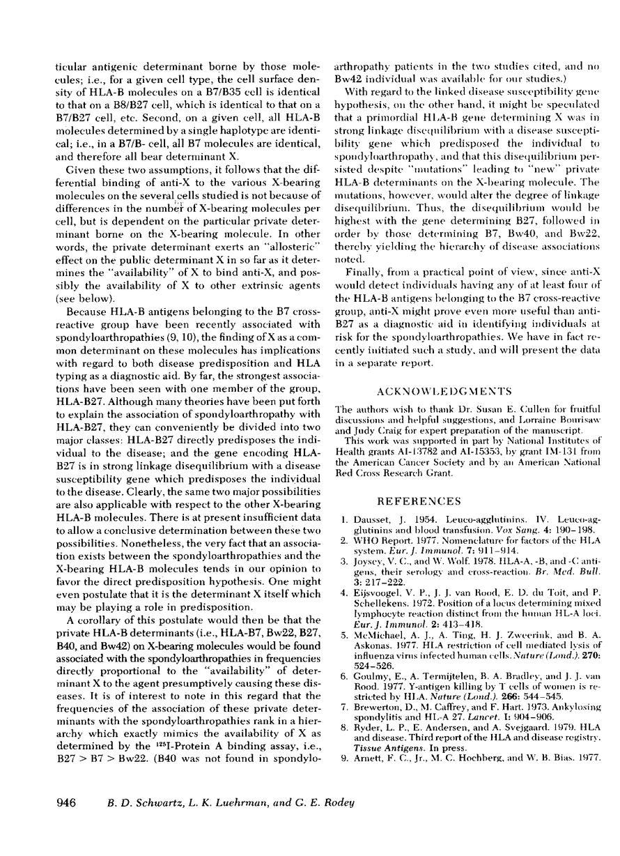 Serologic cross-reactivity among allelic gene products commonly occurs in the HLA complex, but the molecular basis of these serologic phenomena is incompletely characterized. Because of strong cross-reactivity among antigens comprising the B7 cross-reactive group (i.e., HLA-B7, Bw22, B27, B40, and Bw42) and because of the association of several antigens of this group with spondyloarthropathies, we initiated a study of the chemical basis of cross-reactivity among this group of antigens. Using classic serologic procedures, 125I-Protein A binding assay, and chemical immunoprecipitation techniques, we have defined a new antigenic determinant, tentatively designated "X", which is present on certain HLA-B molecules. By a series of sequential immunoprecipitation experiments, X was shown to be a "public" antigenic determinant distinct from the "private" determinants B7, Bw22, B27, and B40, but present on the same 44,000-dalton glycoprotein molecules. The implications of this finding regarding disease predisposition and HLA typing as a diagnostic aid are discussed.