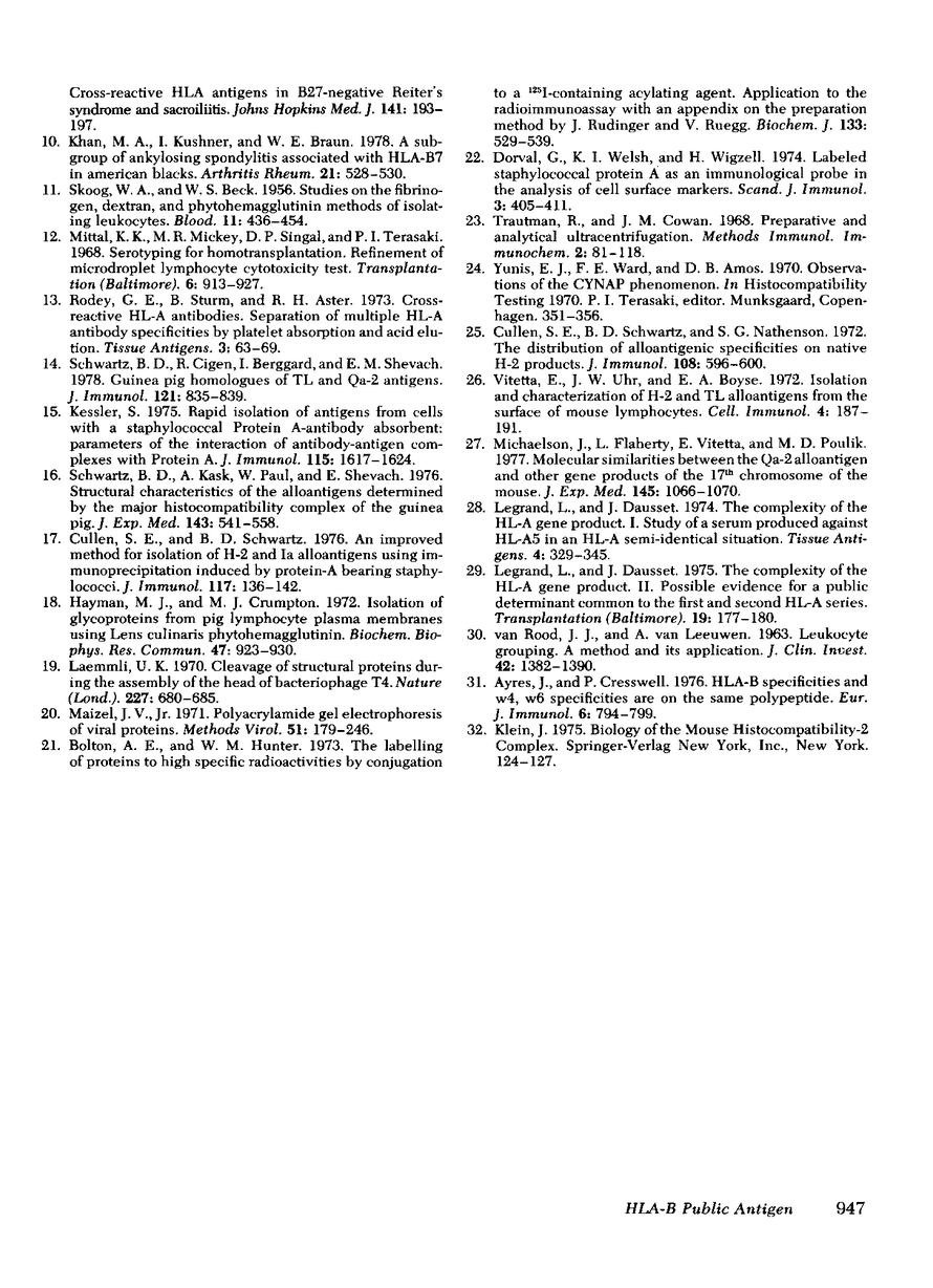 Serologic cross-reactivity among allelic gene products commonly occurs in the HLA complex, but the molecular basis of these serologic phenomena is incompletely characterized. Because of strong cross-reactivity among antigens comprising the B7 cross-reactive group (i.e., HLA-B7, Bw22, B27, B40, and Bw42) and because of the association of several antigens of this group with spondyloarthropathies, we initiated a study of the chemical basis of cross-reactivity among this group of antigens. Using classic serologic procedures, 125I-Protein A binding assay, and chemical immunoprecipitation techniques, we have defined a new antigenic determinant, tentatively designated "X", which is present on certain HLA-B molecules. By a series of sequential immunoprecipitation experiments, X was shown to be a "public" antigenic determinant distinct from the "private" determinants B7, Bw22, B27, and B40, but present on the same 44,000-dalton glycoprotein molecules. The implications of this finding regarding disease predisposition and HLA typing as a diagnostic aid are discussed.