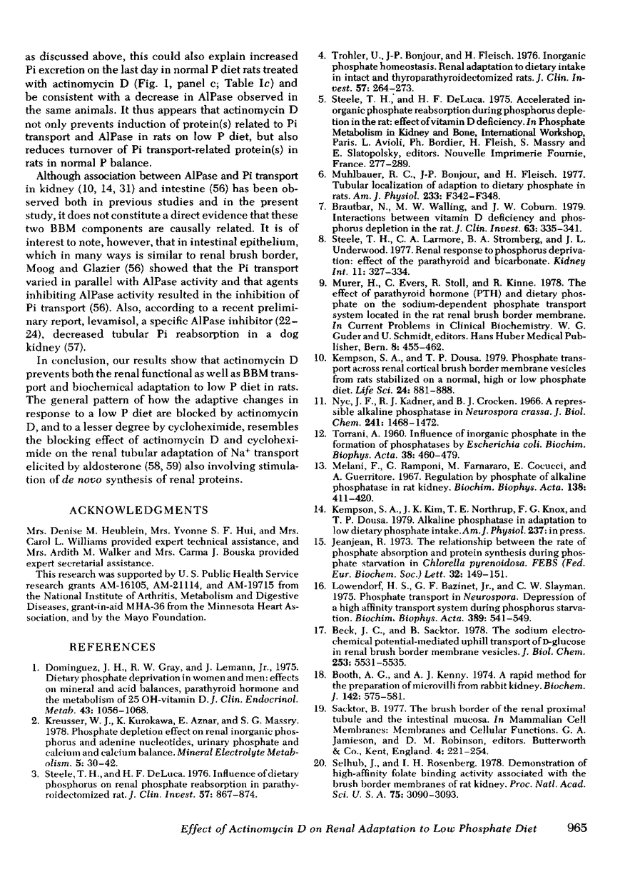The major renal adaptive changes in response to selective dietary phosphate restriction are a marked reduction in urinary excretion of phosphate and an increased urinary excretion of calcium; at the cellular level, there is selective increase in renal cortical brush border membrane phosphate uptake and increase in specific activity of alkaline phosphatase. In the present study we examined whether these functional and biochemical adaptive changes could be blocked by drugs known to inhibit protein synthesis.