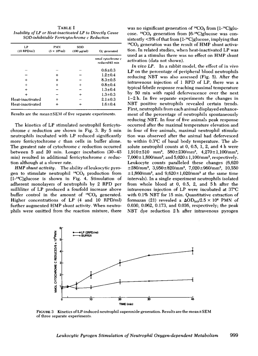 The ability of highly purified human leukocytic pyrogen (LP) to stimulate neutrophil oxygen-dependent metabolism was studied. Human peripheral blood neutrophils exposed to leukocytic pyrogen in vitro demonstrated an increase in the percentage of neutrophils reducing nitroblue tetrazolium (NBT) dye and a marked stimulation of superoxide dismutase inhibitable reduction of ferricytochrome c. LP stimulation of neutrophil oxygen-dependent metabolism was dose and time dependent. Procedures that destroyed the pyrogenicity of LP also abolished the effects on neutrophil metabolism. Neutrophil hexose monophosphate shunt activity was also stimulated by LP. In a rabbit model, the effect of in vivo LP on neutrophil superoxide generation was also studied. There was a consistent increase in the percent and absolute number of NBT positive neutrophils. Peak stimulation of neutrophil metabolism occurred after defervescence suggesting several possible mechanisms. The observations reported here may, in part, explain the nonspecificity of the NBT test in febrile, noninfected patients and provide further understanding of neutrophil physiology during acute inflammation.