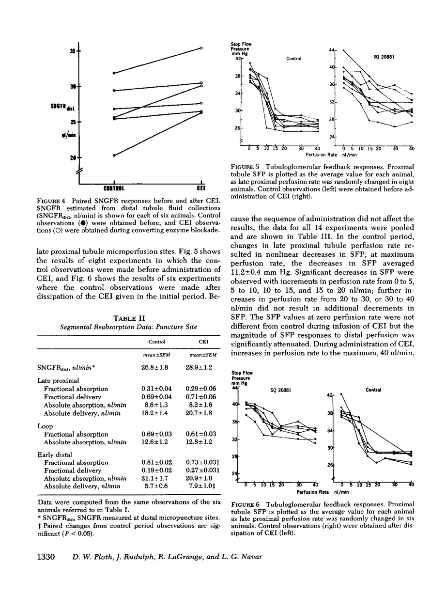Experiments were done in normal rats to assess kidney, single nephron, and tubuloglomerular feedback responses during renin-angiotensin blockade with the converting enzyme inhibitor (CEI) SQ 20881 (E. R. Squibb & Sons, Princeton, N. Y.) (3 mg/kg, per h). Converting enzyme inhibition was documented by complete blockade of vascular responses to infusions of angiotensin I (600 ng/kg). Control plasma renin activity was 12.5±2.7 ng angiotensin I/ml per h (mean±SEM) and increased sevenfold with CEI (n = 7). There were parallel increases in glomerular filtration rate from 1.08±0.05 to 1.26±0.05 ml/min and renal blood flow from 6.7±0.4 to 7.5±0.5 ml/min. During CEI infusion absolute and fractional sodium excretion were increased 10-fold. Proximal tubule and peritubular capillary pressures were unchanged. Single nephron glomerular filtration rate (SNGFR) was measured from both proximal and distal tubule collections; SNGFR based only on distal collections was significantly increased by CEI. A significant difference was observed between SNGFR values measured from proximal and distal tubule sites (6.0±1.6 nl/min) and this difference remained unchanged after CEI administration. Slight decreases in fractional absorption were suggested at micropuncture sites beyond the late proximal tubule, whereas early distal tubule flow rate was augmented by CEI. Tubuloglomerular feedback activity was assessed by measuring changes in proximal tubule stop-flow pressure (SFP) or SNGFR in response to alterations in orthograde microperfusion rate from late proximal tubule sites. During control periods, SFP was decreased 11.2±0.4 mm Hg when the perfusion rate was increased to 40 nl/min; during infusion of CEI, the same increase in perfusion rate resulted in a SFP decrement of 6.7±0.5 mm Hg (P<.001). When late proximal tubule perfusion rate was increased from 0 to 30 nl/min, SNGFR was decreased by 15.0±1.2 nl/min during control conditions, and by 11.3±1.3 nl/min during CEI infusion. Attenuation of feedback responsiveness during CEI was also observed at lower perfusion rates with both techniques. These results indicate that blockade of the renin-angiotensin system with CEI reduces the activity of the tubuloglomerular feedback mechanism which may mediate the observed renal vasodilation.