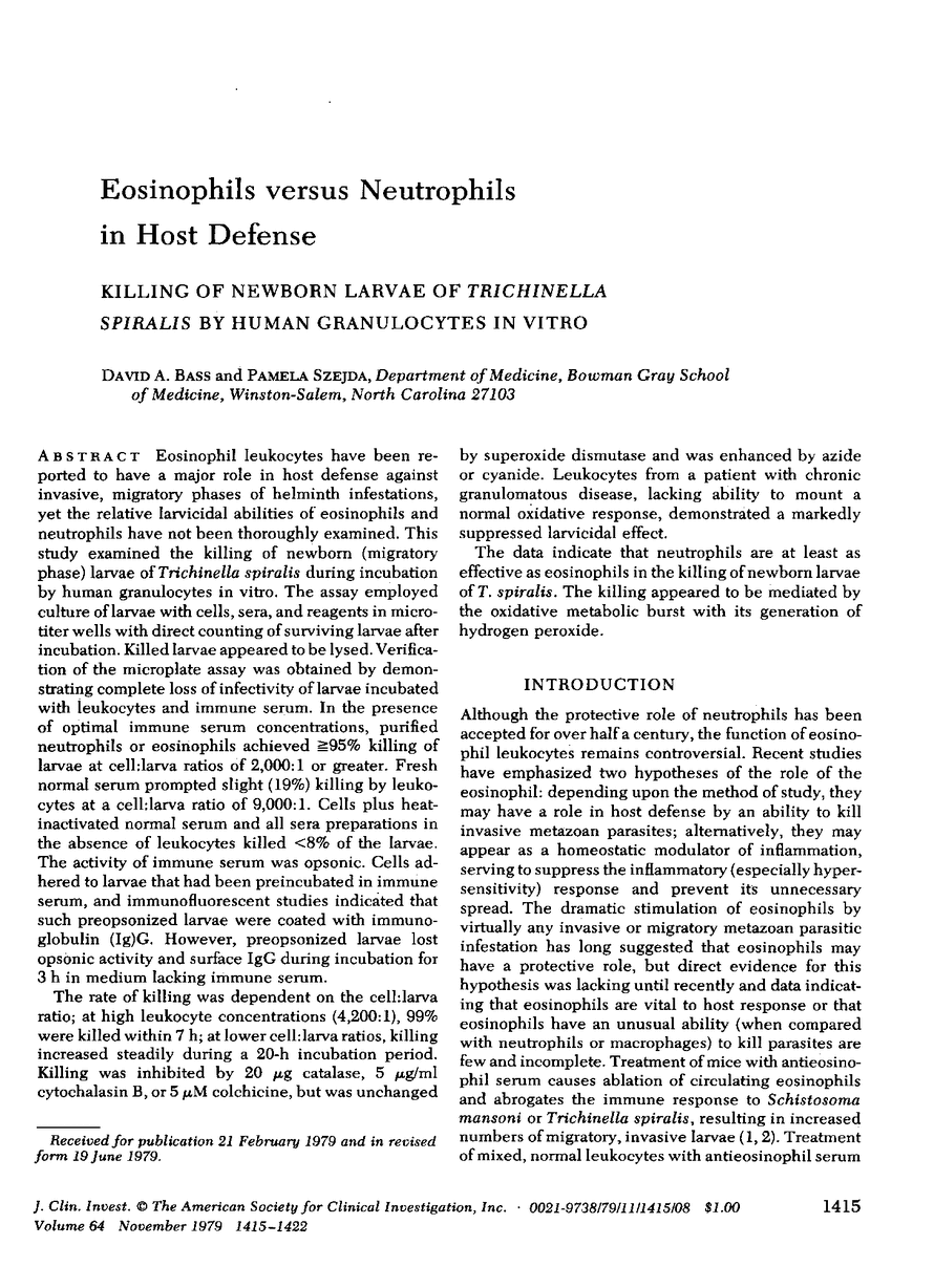 Eosinophil leukocytes have been reported to have a major role in host defense against invasive, migratory phases of helminth infestations, yet the relative larvicidal abilities of eosinophils and neutrophils have not been thoroughly examined. This study examined the killing of newborn (migratory phase) larvae of Trichinella spiralis during incubation by human granulocytes in vitro. The assay employed cultue of larvae with cells, sera, and reagents in microtiter wells with direct counting of surviving larvae after incubation. Killed larvae appeared to be lysed. Verification of the microplate assay was obtained by demonstrating complete loss of infectivity of larvae incubated with leukocytes and immune serum. In the presence of optimal immune serum concentrations, purified neutrophils or eosinophils achieved ≥95% killing of larvae at cell:larva ratios of 2,000:1 or greater. Fresh normal serum prompted slight (19%) killing by leukocytes at a cell:larva ratio of 9,000:1. Cells plus heat-inactivated normal serum and all sera preparations in the absence of leukocytes killed <8% of the larvae. The activity of immune serum was opsonic. Cells adhered to larvae that had been preincubated in immune serum, and immunofluorescent studies indicated that such preopsonized larvae were coated with immunoglobulin (Ig)G. However, preopsonized larvae lost opsonic activity and surface IgG during incubation for 3 h in medium lacking immune serum.