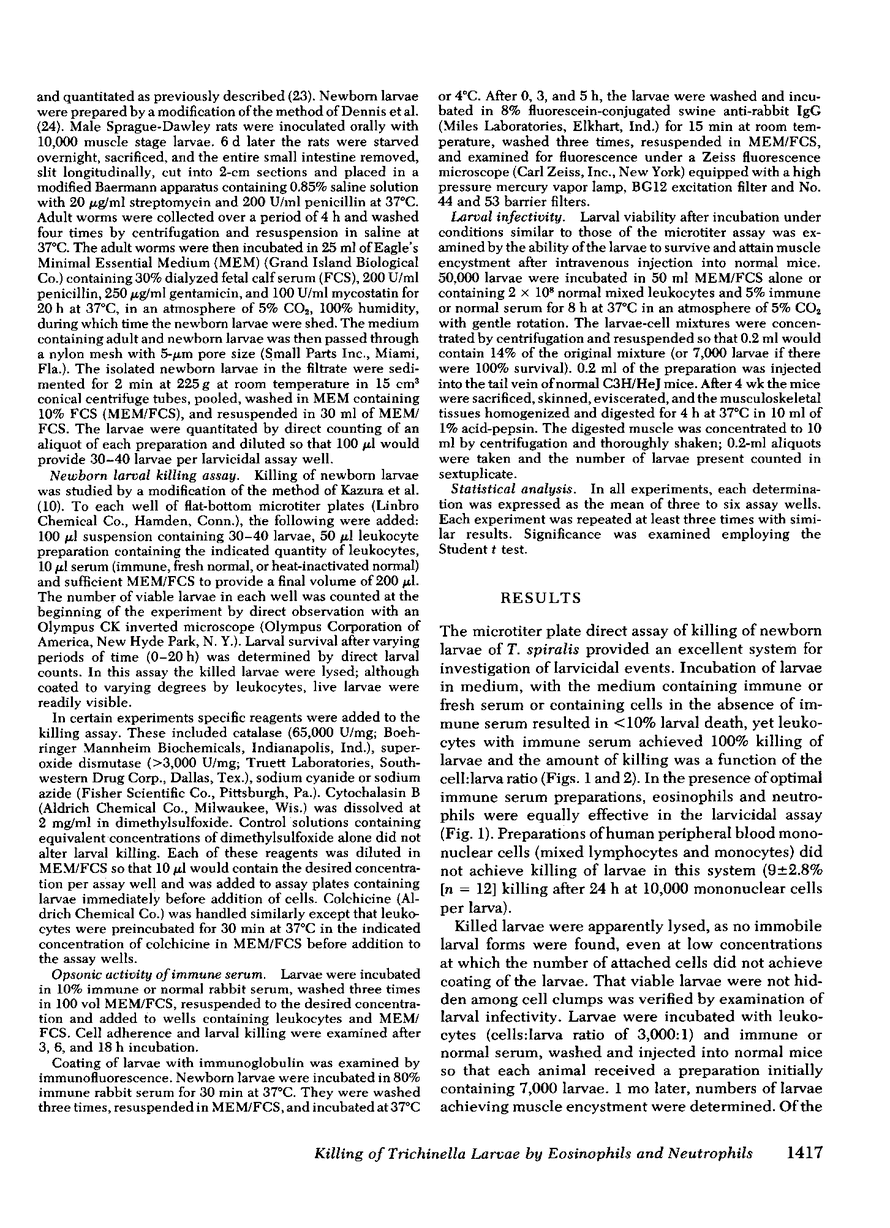 Eosinophil leukocytes have been reported to have a major role in host defense against invasive, migratory phases of helminth infestations, yet the relative larvicidal abilities of eosinophils and neutrophils have not been thoroughly examined. This study examined the killing of newborn (migratory phase) larvae of Trichinella spiralis during incubation by human granulocytes in vitro. The assay employed cultue of larvae with cells, sera, and reagents in microtiter wells with direct counting of surviving larvae after incubation. Killed larvae appeared to be lysed. Verification of the microplate assay was obtained by demonstrating complete loss of infectivity of larvae incubated with leukocytes and immune serum. In the presence of optimal immune serum concentrations, purified neutrophils or eosinophils achieved ≥95% killing of larvae at cell:larva ratios of 2,000:1 or greater. Fresh normal serum prompted slight (19%) killing by leukocytes at a cell:larva ratio of 9,000:1. Cells plus heat-inactivated normal serum and all sera preparations in the absence of leukocytes killed <8% of the larvae. The activity of immune serum was opsonic. Cells adhered to larvae that had been preincubated in immune serum, and immunofluorescent studies indicated that such preopsonized larvae were coated with immunoglobulin (Ig)G. However, preopsonized larvae lost opsonic activity and surface IgG during incubation for 3 h in medium lacking immune serum.