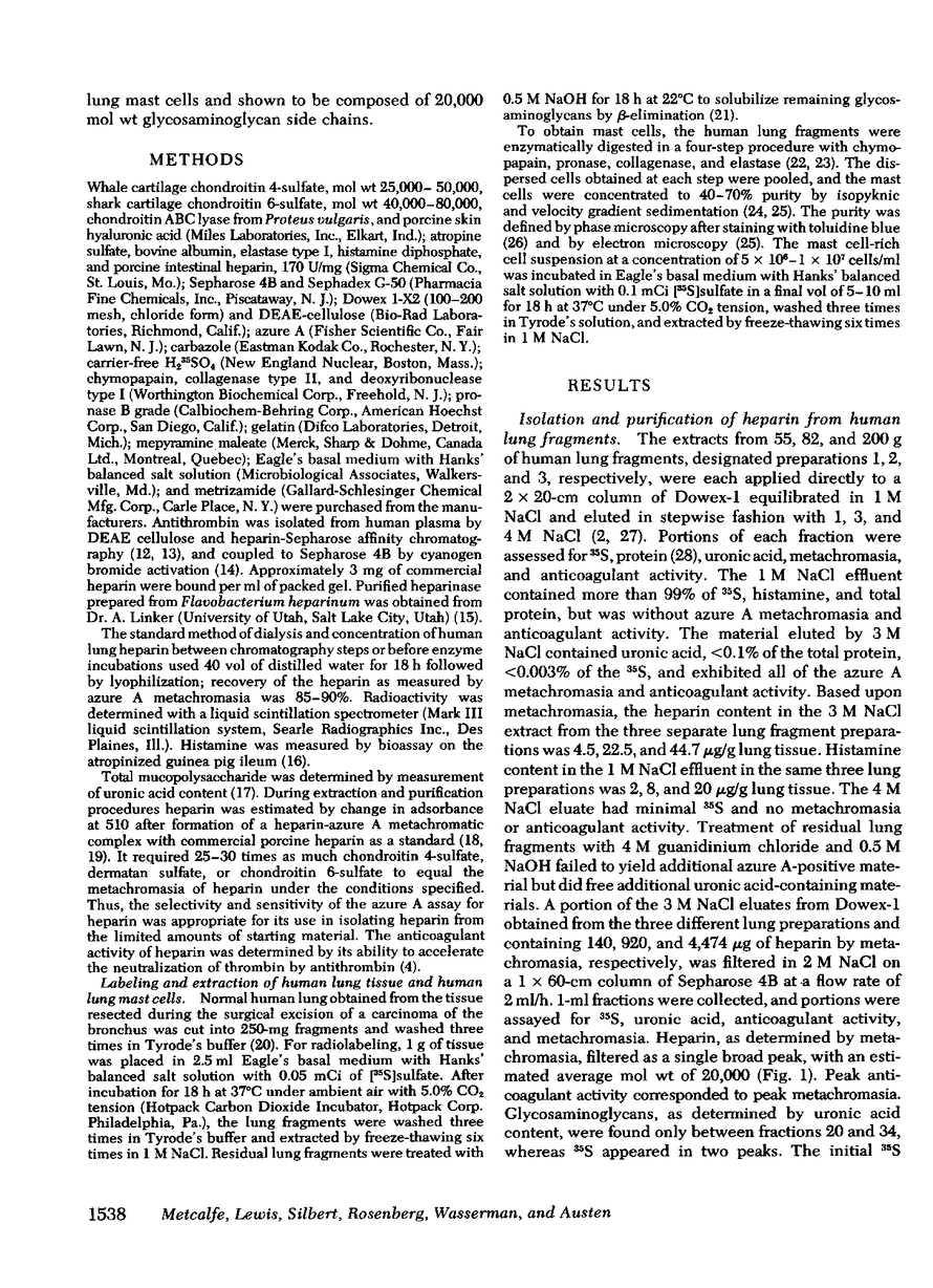 Heparin as measured by azure A metachromasia and anticoagulant activity has been extracted with 1 M NaCl from 35S-labeled human lung fragments or dispersed human lung cells enriched for mast cells. The 35S-labeled metachromatic material in the 3 M NaCl eluate from Dowex-1 chromatography of the extract from lung fragments exhibited an average mol wt of 20,000 by Sepharose 4B gel filtration. The 35S-labeled metachromatic material with the charge characteristics of commercial porcine heparin on DEAE cellulose chromatography was entirely heparin by the criteria of resistance to degradation by chondroitin ABC lyase and complete degradation by purified heparinase. Antithrombin affinity chromatography of purified heparin with an anticoagulant activity of 137 U/mg, revealed that the one-third that was bound and eluted had a 273 U/mg sp act, whereas the unbound activity was 31 U/mg. Thus, the previously observed heterogeneity of commercial porcine heparin for binding to human antithrombin was also observed with human heparin. The mast cell-enriched human lung cell preparations yielded [35S]mucopolysaccharides with an average mol wt of 60,000 by Sepharose 4B gel filtration. Approximately 30% of this fraction was degraded by chondroitin ABC lyase, and the residual 70% was degraded by purified heparinase. When the chondroitin ABC lyase-resistant fraction was subjected to alkali degradation the average mol wt was reduced to 20,000. The calculated human lung mast cell heparin content of 2.4-7.8 μg/106 cells gave a ratio to histamine on a weight basis similar to that of intact lung fragments, thereby implying that heparin in the lung fragments was largely restricted to the mast cells.