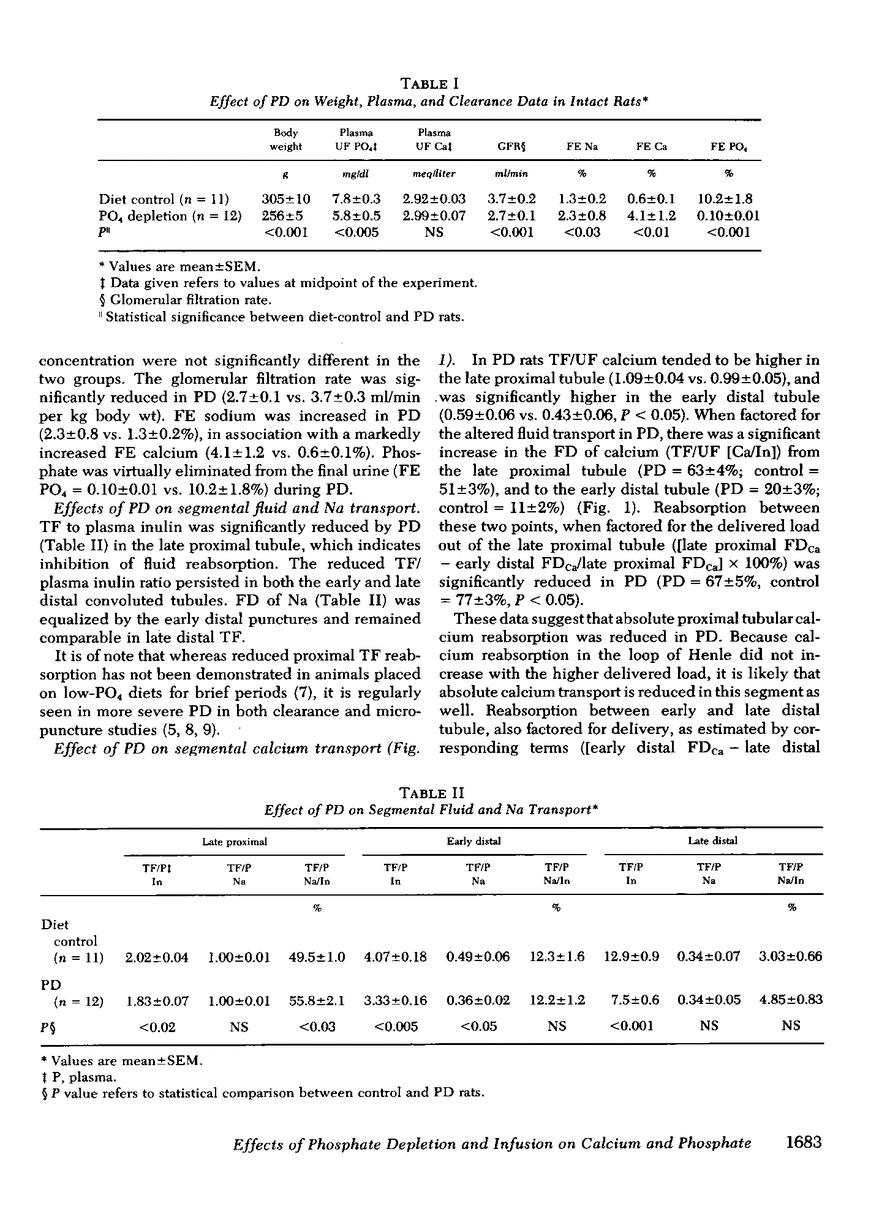 Increased calcium (Ca) excretion is characteristic of chronic phosphate (PO4) depletion (PD). To study the changes in tubular transport and the site of the hypocalciuric effect of PO4 administration, clearance and micropuncture experiments were performed in intact rats pair fed either a control diet (0.5% PO4) or a PO4-depleted (PD) diet (0.01% PO4) plus Al(OH3) and in parathyroidectomized (PTX) PD rats, infused either with saline or with neutral sodium PO4.