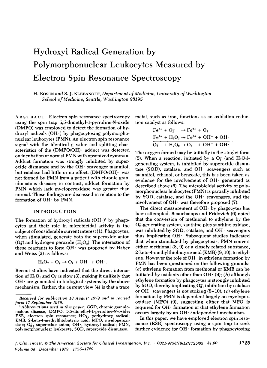 Electron spin resonance spectroscopy using the spin trap 5,5-dimethyl-1-pyrroline-N-oxide (DMPO) was employed to detect the formation of hydroxyl radicals (OH.) by phagocytosing polymorphonuclear leukocytes (PMN). An electron spin resonance signal with the identical g value and splitting characteristics of the DMPO/OH). adduct was detected on incubation of normal PMN with opsonized zymosan. Adduct formation was strongly inhibited by superoxide dismutase and by the OH. scavenger mannitol, but catalase had little or no effect. (DMPO/OH). was not formed by PMN from a patient with chronic granulomatous disease; in contrast, adduct formation by PMN which lack myeloperoxidase was greater than normal. These findings are discussed in relation to the formation of OH. by PMN.