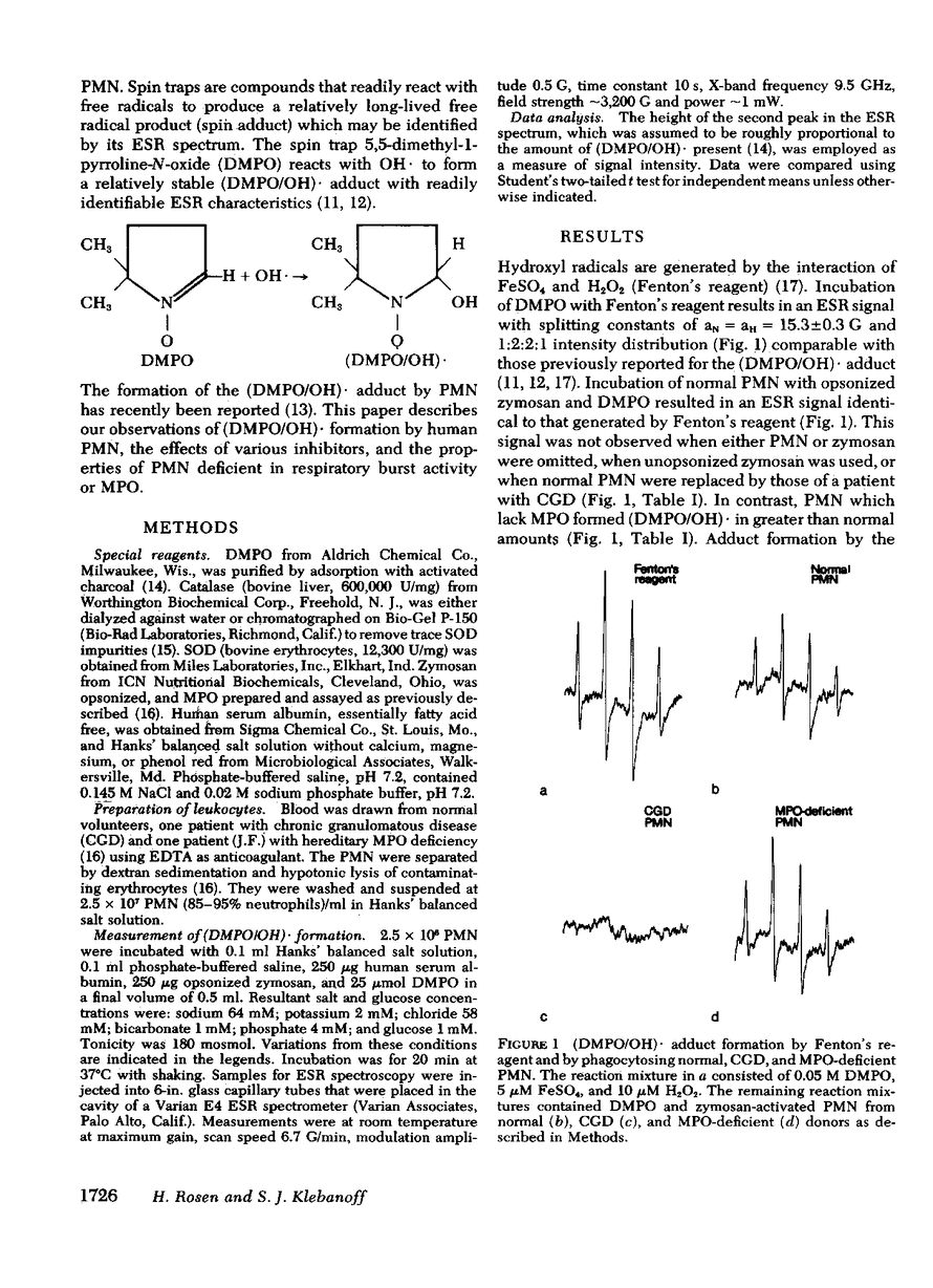 Electron spin resonance spectroscopy using the spin trap 5,5-dimethyl-1-pyrroline-N-oxide (DMPO) was employed to detect the formation of hydroxyl radicals (OH.) by phagocytosing polymorphonuclear leukocytes (PMN). An electron spin resonance signal with the identical g value and splitting characteristics of the DMPO/OH). adduct was detected on incubation of normal PMN with opsonized zymosan. Adduct formation was strongly inhibited by superoxide dismutase and by the OH. scavenger mannitol, but catalase had little or no effect. (DMPO/OH). was not formed by PMN from a patient with chronic granulomatous disease; in contrast, adduct formation by PMN which lack myeloperoxidase was greater than normal. These findings are discussed in relation to the formation of OH. by PMN.