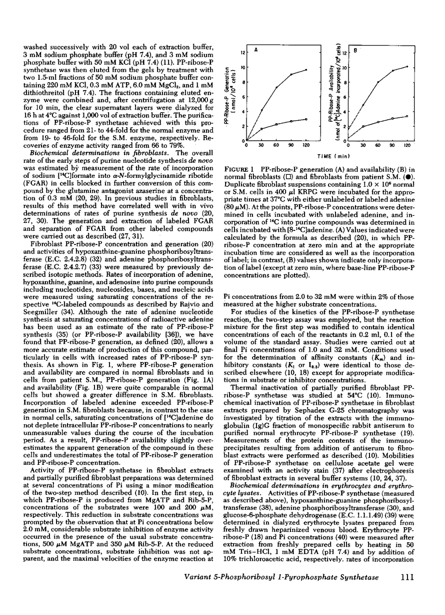 An inherited, structurally abnormal and superactive form of the enzyme 5-phosphoribosyl 1-pyrophosphate (PP-ribose-P) synthetase (EC 2.7.6.1) has been characterized in fibroblasts cultured from a 14-yr-old male (S.M.) with clinical manifestations of uric acid overproduction present since infancy. PP-ribose-P synthetase from the cells of this child showed four- to fivefold greater than normal resistance to purine nucleotide (ADP and GDP) feedback inhibition of enzyme activity and hyperbolic rather than sigmoidal inorganic phosphate (Pi) activation in incompletely dialyzed extracts. Excessive maximal velocity of the enzyme reaction catalyzed by the mutant enzyme was indicated by: enzyme activities twice those of normal at all concentrations of Pi in chromatographed fibroblast extracts; normal affinity constants for substrates and for the activator, Mg2+; and twofold greater than normal activity per immunoreactive enzyme molecule. The mutant enzyme thus possessed deficient regulatory and superactive catalytic properties, two mechanisms previously demonstrated individually to underlie the excessive PPRribose-P and uric acid synthesis of affected members of families with superactive PP-ribose-P synthetases. Increased PP-ribose-P concentration (4-fold) and generation (2.7-fold) and enhanced rates of PP-ribose-P dependent purine synthetic reactions, including purine synthesis de novo, in S.M. fibroblasts confirmed the functional significance of this patient's mutant enzyme. Diminished stability of the variant PP-ribose-P synthetase was manifested in vitro by increased thermal lability and in vivo by deficiency of enzyme activity at Pi concentrations greater than 0.3 mM in hemolysates and by an accelerated, age-related decrement in enzyme activity in lysates of erythrocytes separated by specific density. Despite the diminished amount of PP-ribose-P synthetase in the S.M. erythrocyte population, S.M. erythrocytes had increased PP-ribose-P concentration and increased rates of incorporation of [14C]adenine and hypoxanthine into acid-soluble nucleotides during incubation at 1 mM Pi. These findings provided further confirmation of the extent to which PP-ribose-P synthesis is modulated in the normal cell at physiological Pi concentration by purine nucleotide inhibition of PP-ribose-P synthetase. The activity and kinetic characteristics of PP-ribose-P synthetase from fibroblasts of the mother of patient S.M. indicated that this woman was a heterozygous carrier of the enzyme defect expressed in hemizygous manner by her son.