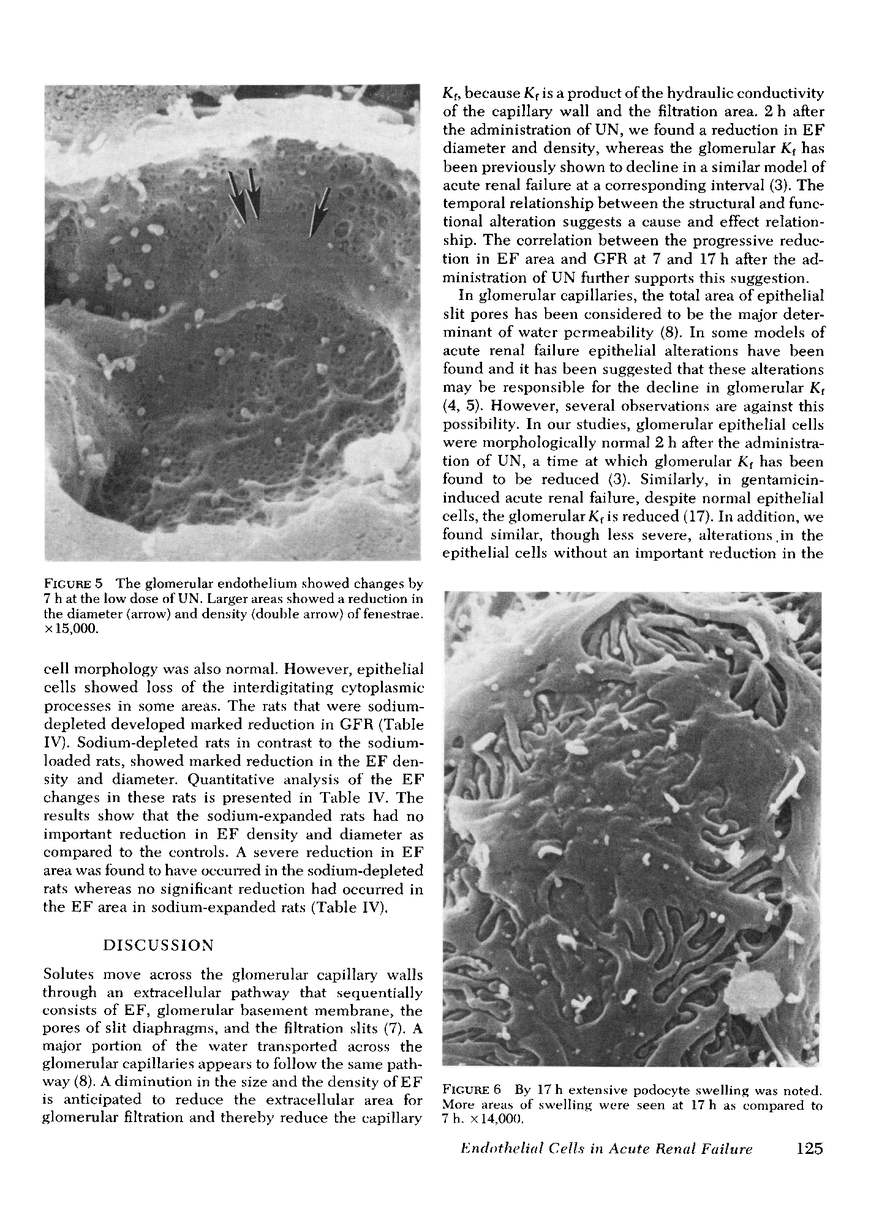 In uranyl nitrate (UN)-induced acute renal failure (ARF) glomerular ultrafiltration coefficient (Kf) decreases because of unknown reasons. Since transport of water across the glomerular capillary wall occurs predominantly extracellularly through the endothelial fenestrae (EF), a reduction in the diameter and/or the density of EF can reduce the extracellular filtration area and the glomerular Kf. To examine this possibility, ARF was induced in rats by intravenous administration of UN in low (15 mg/kg) and high doses (25 mg/kg). Fenestral density (¯x±SEM) per 5 cm2 from the scanning electron micrographs (×30,000) was 107±10, 103±9, and 101±11 at 2, 7, and 17 h after the intravenous administration of bicarbonate saline to the control rats. In the low-dose UN group the EF density was 91±2, 52±8, and 45±11 at 2, 7, and 17 h after the injection, whereas for the high-dose group at corresponding time intervals the EF density was 95±3, 54±9, and 44±10. Fenestral diameters, in Angstrom units (¯x±SEM), were 751±53, 765±43, and 764±37 at 2, 7, and 17 h after the injection of bicarbonate saline to control rats. At corresponding intervals after the administration of UN, the fenestral diameters were 501±61, 472±28, and 438±98 for the low-dose group and 525±43, 470±39, and 440±56 for the high-dose group. 2, 7, and 17 h after the injection of UN, fenestral area of the low-dose group decreased to 52.1, 30.1, and 24.6% of the controls, whereas in the high-dose group, the fenestral area declined to 54.3, 30.2, and 23.6% of the controls. Administration of UN (15 mg/kg) to sodium-loaded rats did not alter renal function or endothelial cell morphology. It is suggested that in UN-induced ARF the morphological alterations in endothelial cells reduce the Kf of glomerular capillaries by reducing the filtration area.