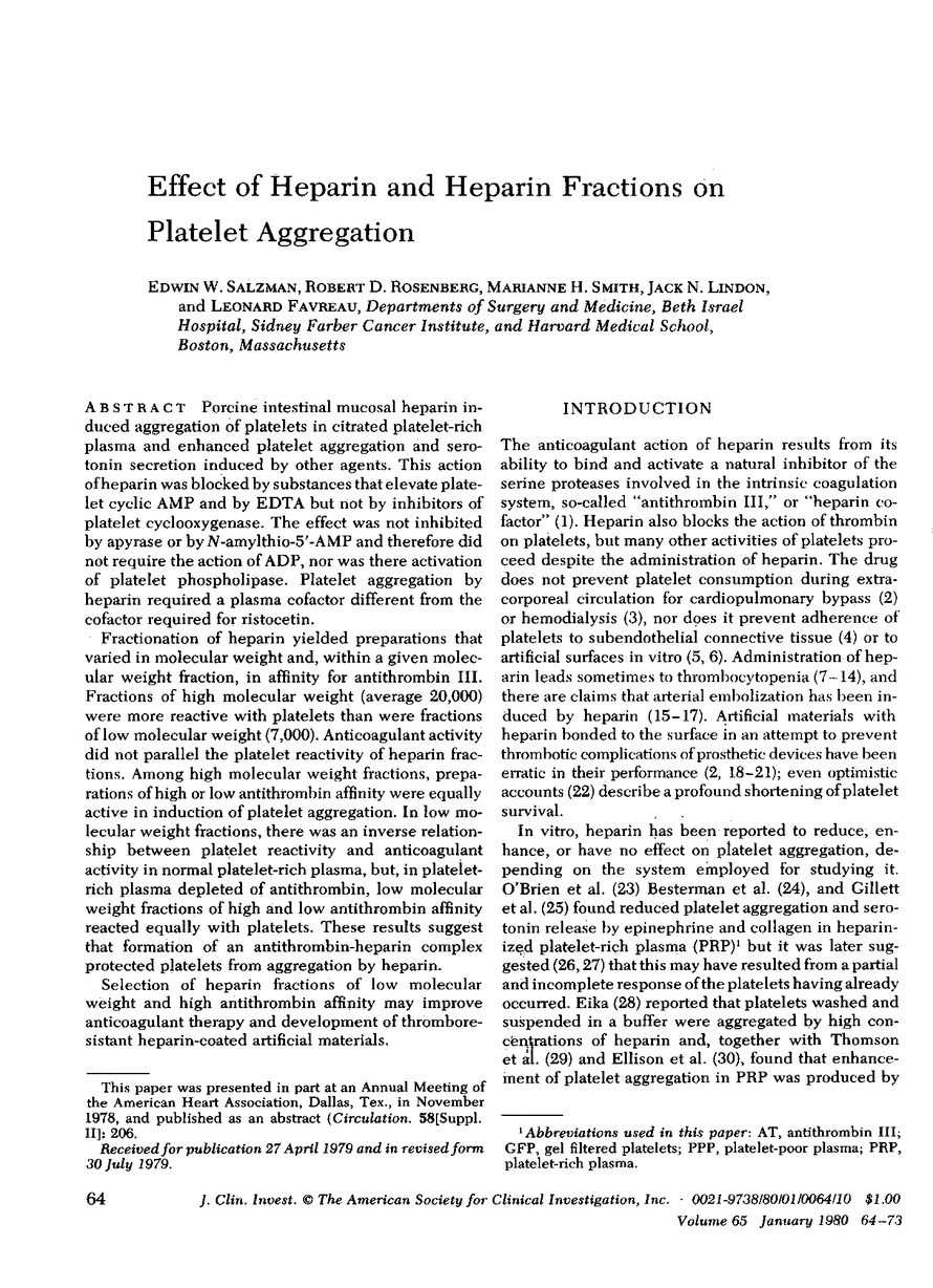 Porcine intestinal mucosal heparin induced aggregation of platelets in citrated platelet-rich plasma and enhanced platelet aggregation and serotonin secretion induced by other agents. This action of heparin was blocked by substances that elevate platelet cyclic AMP and by EDTA but not by inhibitors of platelet cyclooxygenase. The effect was not inhibited by apyrase or by N-amylthio-5′-AMP and therefore did not require the action of ADP, nor was there activation of platelet phospholipase. Platelet aggregation by heparin required a plasma cofactor different from the cofactor required for ristocetin.