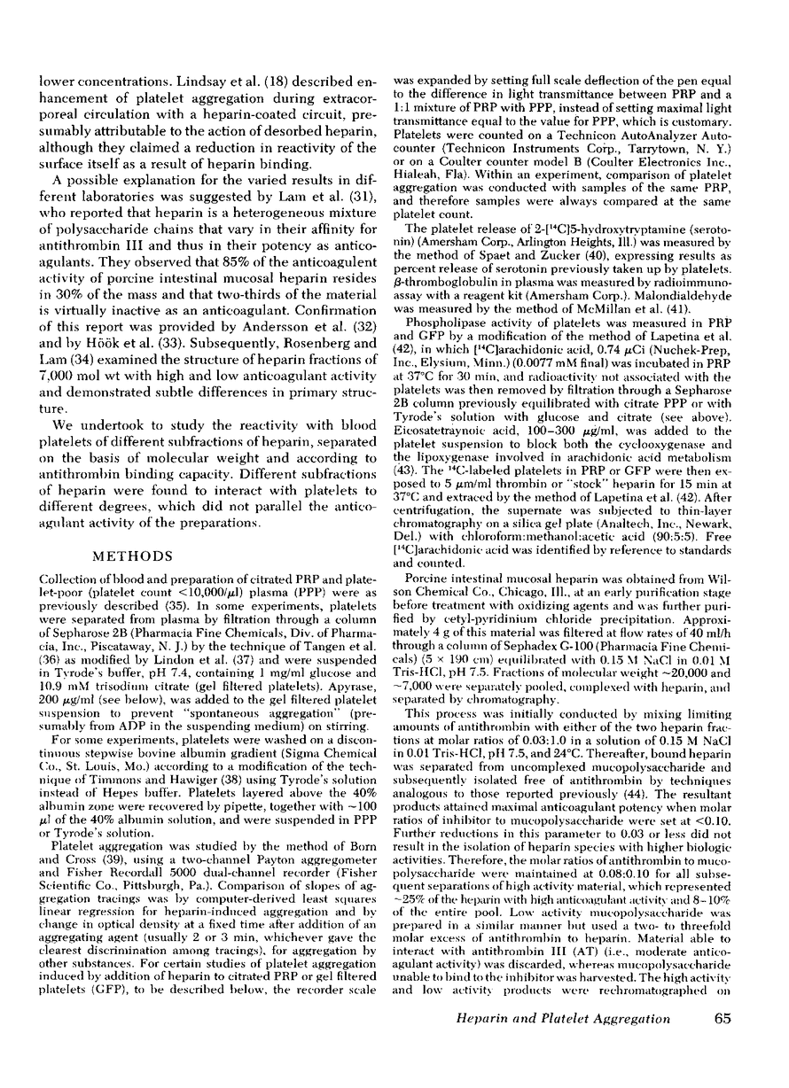 Porcine intestinal mucosal heparin induced aggregation of platelets in citrated platelet-rich plasma and enhanced platelet aggregation and serotonin secretion induced by other agents. This action of heparin was blocked by substances that elevate platelet cyclic AMP and by EDTA but not by inhibitors of platelet cyclooxygenase. The effect was not inhibited by apyrase or by N-amylthio-5′-AMP and therefore did not require the action of ADP, nor was there activation of platelet phospholipase. Platelet aggregation by heparin required a plasma cofactor different from the cofactor required for ristocetin.