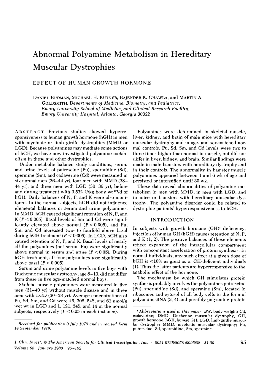 Previous studies showed hyperre-sponsiveness to human growth hormone (hGH) in men with myotonic or limb girdle dystrophies (MMD or LGD). Because polyamines may mediate some actions of hGH, we have now investigated polyamine metabolism in these and other dystrophies.