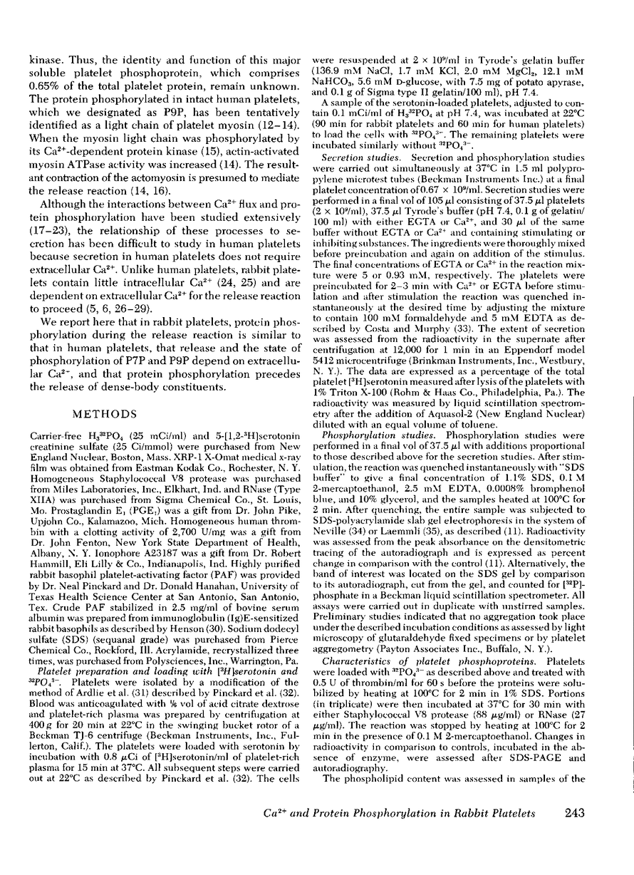 Ca2+ flux and protein phosphorylation have been implicated as playing an important role in the induction of the platelet release reaction. However, the interactions between Ca2+, protein phosphorylation, and the release reaction have been difficult to study because secretion in human platelets is independent of extracellular Ca2+. Thus, we studied rabbit platelets, which, unlike human platelets, require extracellular Ca2+ for serotonin release to occur. Thrombin, basophil platelet-activating factor (PAF), or ionophore A23187 treatment of intact 32PO43--loaded rabbit platelets resulted in a 200-400% increase in phosphorylation of P7P and P9P, respectively. These peptides were similar in all respects to the peptides phosphorylated in thrombin-treated human platelets. When Ca2+ was replaced in the medium by EGTA, (a) thrombin- and PAF-induced rabbit platelet [3H]serotonin release was inhibited by 60-75%, whereas ionophore-induced release was blocked completely; (b) thrombin-, PAF-, or ionophore-induced P9P phosphorylation was inhibited by 60%; and (c) ionophore-induced P7P phosphorylation was decreased by 60%, whereas that caused by thrombin or PAF was decreased by only 20%. At 0.25-0.5 U/ml of thrombin, phosphorylation preceded [3H]serotonin release with the time for half-maximal release being 26.0 +/- 1.3 s SE (n = 3) and the time for half-maximal phosphorylation being 12.3 +/- 1.3 s SE (n = 3) for P7P and 3.7 +/- 0.17 s SE (n = 3) for P9P. P9P phosphorylation was significantly inhibited (P less than 0.015) by removal by Ca2+ from the medium at a time point before any thrombin- or ionophore-induced serotonin release was detectable. Thus, our data suggest that Ca2+ flux precedes the onset of serotonin secretion and that the rabbit platelet is an appropriate model in which to study the effects of Ca2+ on protein phosphorylation during the platelet release reaction.