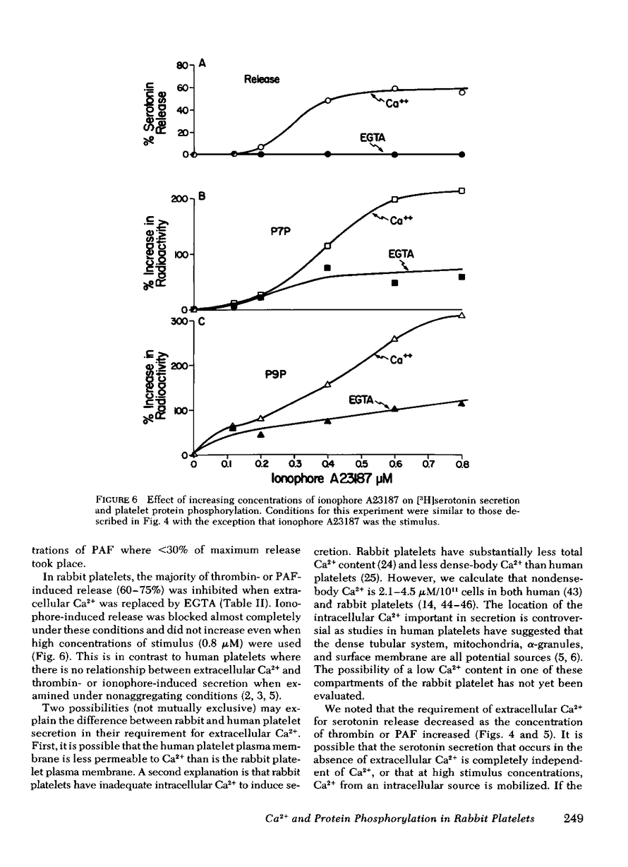 Ca2+ flux and protein phosphorylation have been implicated as playing an important role in the induction of the platelet release reaction. However, the interactions between Ca2+, protein phosphorylation, and the release reaction have been difficult to study because secretion in human platelets is independent of extracellular Ca2+. Thus, we studied rabbit platelets, which, unlike human platelets, require extracellular Ca2+ for serotonin release to occur. Thrombin, basophil platelet-activating factor (PAF), or ionophore A23187 treatment of intact 32PO43--loaded rabbit platelets resulted in a 200-400% increase in phosphorylation of P7P and P9P, respectively. These peptides were similar in all respects to the peptides phosphorylated in thrombin-treated human platelets. When Ca2+ was replaced in the medium by EGTA, (a) thrombin- and PAF-induced rabbit platelet [3H]serotonin release was inhibited by 60-75%, whereas ionophore-induced release was blocked completely; (b) thrombin-, PAF-, or ionophore-induced P9P phosphorylation was inhibited by 60%; and (c) ionophore-induced P7P phosphorylation was decreased by 60%, whereas that caused by thrombin or PAF was decreased by only 20%. At 0.25-0.5 U/ml of thrombin, phosphorylation preceded [3H]serotonin release with the time for half-maximal release being 26.0 +/- 1.3 s SE (n = 3) and the time for half-maximal phosphorylation being 12.3 +/- 1.3 s SE (n = 3) for P7P and 3.7 +/- 0.17 s SE (n = 3) for P9P. P9P phosphorylation was significantly inhibited (P less than 0.015) by removal by Ca2+ from the medium at a time point before any thrombin- or ionophore-induced serotonin release was detectable. Thus, our data suggest that Ca2+ flux precedes the onset of serotonin secretion and that the rabbit platelet is an appropriate model in which to study the effects of Ca2+ on protein phosphorylation during the platelet release reaction.