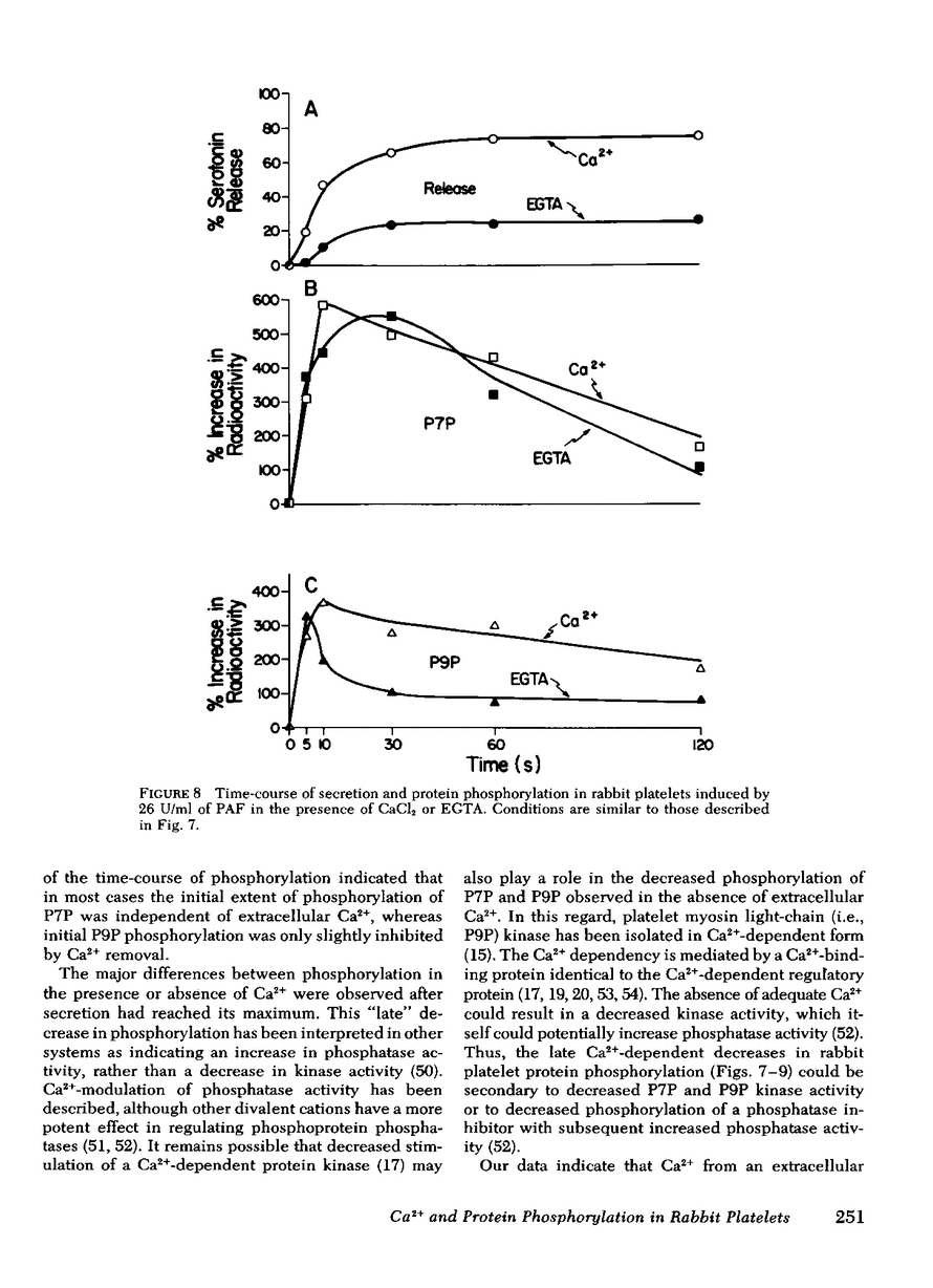 Ca2+ flux and protein phosphorylation have been implicated as playing an important role in the induction of the platelet release reaction. However, the interactions between Ca2+, protein phosphorylation, and the release reaction have been difficult to study because secretion in human platelets is independent of extracellular Ca2+. Thus, we studied rabbit platelets, which, unlike human platelets, require extracellular Ca2+ for serotonin release to occur. Thrombin, basophil platelet-activating factor (PAF), or ionophore A23187 treatment of intact 32PO43--loaded rabbit platelets resulted in a 200-400% increase in phosphorylation of P7P and P9P, respectively. These peptides were similar in all respects to the peptides phosphorylated in thrombin-treated human platelets. When Ca2+ was replaced in the medium by EGTA, (a) thrombin- and PAF-induced rabbit platelet [3H]serotonin release was inhibited by 60-75%, whereas ionophore-induced release was blocked completely; (b) thrombin-, PAF-, or ionophore-induced P9P phosphorylation was inhibited by 60%; and (c) ionophore-induced P7P phosphorylation was decreased by 60%, whereas that caused by thrombin or PAF was decreased by only 20%. At 0.25-0.5 U/ml of thrombin, phosphorylation preceded [3H]serotonin release with the time for half-maximal release being 26.0 +/- 1.3 s SE (n = 3) and the time for half-maximal phosphorylation being 12.3 +/- 1.3 s SE (n = 3) for P7P and 3.7 +/- 0.17 s SE (n = 3) for P9P. P9P phosphorylation was significantly inhibited (P less than 0.015) by removal by Ca2+ from the medium at a time point before any thrombin- or ionophore-induced serotonin release was detectable. Thus, our data suggest that Ca2+ flux precedes the onset of serotonin secretion and that the rabbit platelet is an appropriate model in which to study the effects of Ca2+ on protein phosphorylation during the platelet release reaction.
