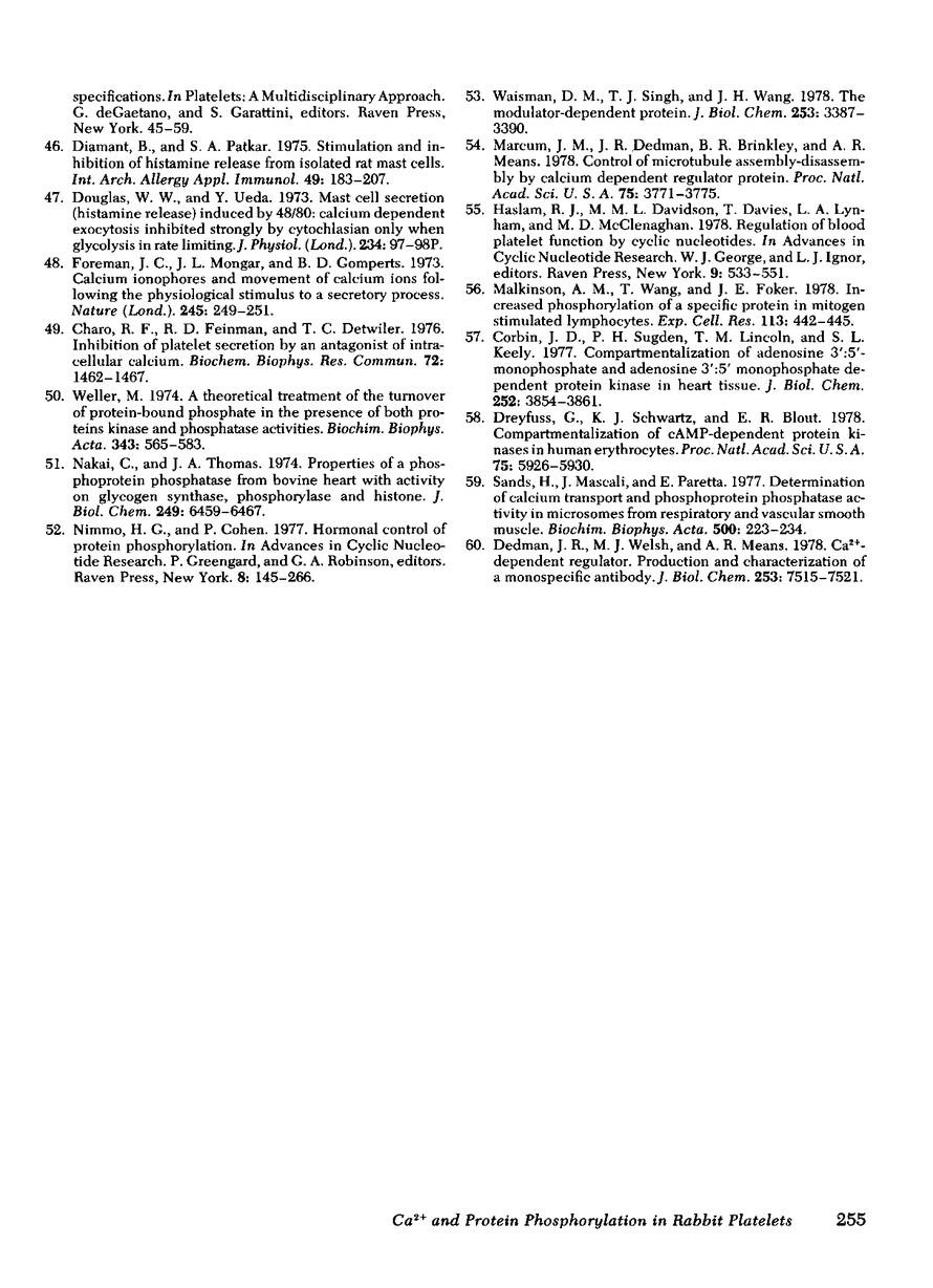 Ca2+ flux and protein phosphorylation have been implicated as playing an important role in the induction of the platelet release reaction. However, the interactions between Ca2+, protein phosphorylation, and the release reaction have been difficult to study because secretion in human platelets is independent of extracellular Ca2+. Thus, we studied rabbit platelets, which, unlike human platelets, require extracellular Ca2+ for serotonin release to occur. Thrombin, basophil platelet-activating factor (PAF), or ionophore A23187 treatment of intact 32PO43--loaded rabbit platelets resulted in a 200-400% increase in phosphorylation of P7P and P9P, respectively. These peptides were similar in all respects to the peptides phosphorylated in thrombin-treated human platelets. When Ca2+ was replaced in the medium by EGTA, (a) thrombin- and PAF-induced rabbit platelet [3H]serotonin release was inhibited by 60-75%, whereas ionophore-induced release was blocked completely; (b) thrombin-, PAF-, or ionophore-induced P9P phosphorylation was inhibited by 60%; and (c) ionophore-induced P7P phosphorylation was decreased by 60%, whereas that caused by thrombin or PAF was decreased by only 20%. At 0.25-0.5 U/ml of thrombin, phosphorylation preceded [3H]serotonin release with the time for half-maximal release being 26.0 +/- 1.3 s SE (n = 3) and the time for half-maximal phosphorylation being 12.3 +/- 1.3 s SE (n = 3) for P7P and 3.7 +/- 0.17 s SE (n = 3) for P9P. P9P phosphorylation was significantly inhibited (P less than 0.015) by removal by Ca2+ from the medium at a time point before any thrombin- or ionophore-induced serotonin release was detectable. Thus, our data suggest that Ca2+ flux precedes the onset of serotonin secretion and that the rabbit platelet is an appropriate model in which to study the effects of Ca2+ on protein phosphorylation during the platelet release reaction.