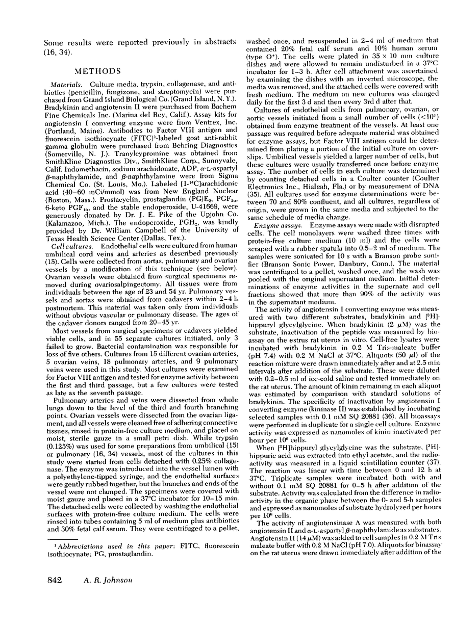 Endothelial cells were cultured from various different human vessels, including aortas, pulmonary, ovarian, and umbilical arteries, and pulmonary, ovarian, and umbilical veins. The cultured cells were identified as endothelial cells by the presence of Factor VIII antigen and antiotensin I converting enzyme (kininase II). They retained these markers for at least five passages in culture, and some cells had them for seven passages or more. Endothelial cells from the various vessels were compared with respect to their ability to metabolize angiotensins I and II and bradykinin. Cells from arteries had three to five times the angiotensin I converting enzyme activity as cells from veins. The activity of angiotensinase A (aspartyl aminopeptidase) had a similar distribution, and cells from arteries were consistently more active than cells from veins. Cultures of endothelial cells from pulmonary and umbilical vessels formed prostacyclin in response to mechanical stimulation. Media from cell monolayers that were subjected to a change of medium and gentle agitation inhibited aggregation of human platelets. This inhibitory activity was generated within 2-5 min, and it was not formed by cells that were treated with indomethacin or tranylcypromine. Addition of prostaglandin (PG)H2 to indomethacin-treated cells restored the ability to form the inhibitor, but cells treated with tranylcypromine were not responsive to PGH2. In experiments where [14C]arachidonic acid was added to the cells before stimulation, the major metabolite identified by thin-layer chromatography was 6-keto PGF1α. Thus, it appears that pulmonary endothelial cells, as well as umbilical cord cells, can form prostacyclin. In experiments comparing the ability of arterial and venous cells to form prostacyclin, arterial cells were more active than venous cells. These studies of cells from various human vessels suggest that the vascular origin of cultured endothelial cells determines how they metabolize vasoactive peptides and form prostacyclin.