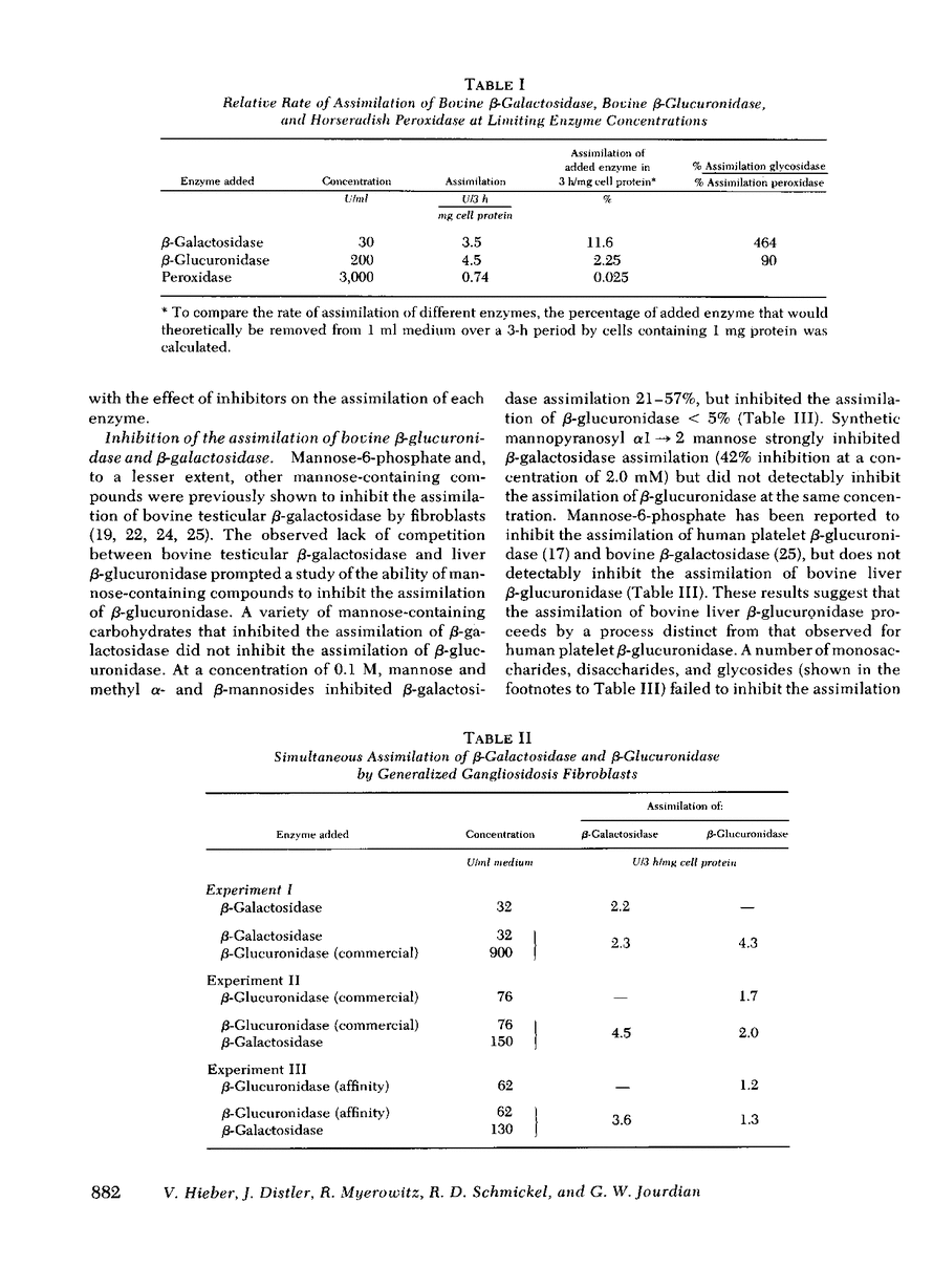 Bovine liver beta-glucuronidase and testicular beta-galactosidase were assimilated by generalized gangliosidosis fibroblasts at respectively rates of 90 and 464 times the rate of assimilation of horseradish peroxidase. Assimilation of either of the two enzymes by the fibroblasts was saturable, suggesting the participation of receptor-mediated adsorptive endocytosis for internalization. The rate of assimilation of either enzyme was not affected by high levels of the other enzyme, suggesting that distinct receptors for each enzyme occur on the fibroblasts' cell surface. Furthermore, although assimilation of beta-galactosidase was inhibited by mannose, methyl mannosides, mannosyl alpha 1 leads to 2 mannose, and mannose-6-phosphate, these compounds did not detectably inhibit the assimilation of beta-glucuronidase. These results suggest that testicular beta-galactosidase was assimilated by the well-established phosphomannosyl recognition system. However, liver beta-glucuronidase was assimilated by a distinct, noncompeting, and as yet undefined, recognition system.
