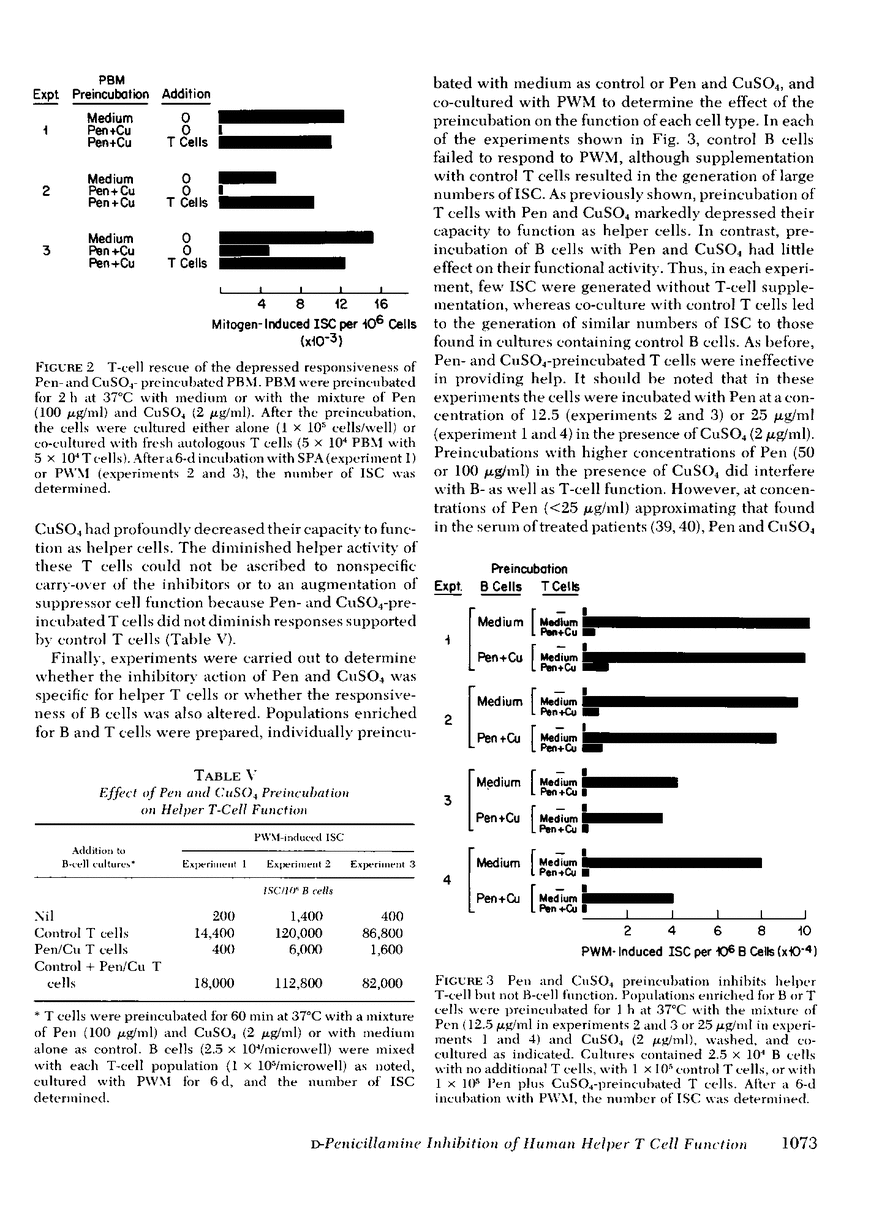 The effect of d-penicillamine (Pen) and mixtures of Pen and copper sulfate on the capacity of normal human peripheral blood mononuclear cells (PBM) to generate immunoglobulin-secreting cells (ISC) in response to the T-cell-dependent polyclonal B-cell activators pokeweed mitogen (PWM) and staphylococcal protein A (SPA) was examined. PBM obtained from normal individuals were incubated for 1-2 h at 37°C with medium alone, Pen, CuSO4, or a mixture of Pen and CuSO4. After washing, the cells were incubated for 6-7 d with PWM or SPA and then, with a reverse hemolytic plaque assay, assayed for the number of ISC generated. Preincubation of PBM with either Pen (100 μg/ml) or CuSO4 (2 μg/ml) did not alter the subsequent capacity of the cells to generate ISC in response to PWM or SPA. In contrast, responsiveness to both mitogens was nearly abolished when PBM were similarly preincubated with a mixture of Pen and CuSO4. Inhibition of responsiveness could not be ascribed to cell death, carry-over of the inhibitors, or an alteration in the concentration of PWM or the length of incubation yielding maximum responses. Co-culture experiments demonstrated that Pen and CuSO4 preincubation had not caused augmented suppressor cell function. Experiments in which PBM were separated into adherent and nonadherent populations indicated that Pen and CuSO4 preincubation inhibited the responsiveness of the nonadherent cells but did not alter the accessory cell function of monocytes. To determine whether Pen and CuSO4 preincubation effected T- or B-cell function, PBM were separated into B- and T-cell-enriched populations, individually preincubated with Pen and CuSO4, and then co-cultured with PWM. The results indicated that Pen and CuSO4 markedly inhibited helper T-cell function and had little effect on the capacity of B cells to generate ISC. The observation that in the presence of CuSO4 Pen inhibits helper T-cell activity may, in part, explain the therapeutic efficacy of Pen in rheumatoid arthritis and especially the capacity of Pen therapy to decrease antiglobulin titers in treated patients.