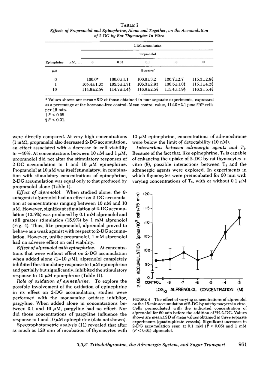 Isolated rat thymocytes were preincubated with various catecholamines, alone and together with 3,5,3′-triiodothyronine (T3), and the accumulation of the glucose analogues, 2-deoxy-d-glucose (2-DG) and 3-O-methylglucose (3-O-MG), was then measured. Epinephrine induced a time- and dose-dependent increase in the 15-min accumulation of 2-DG; at a concentration of 100 μM epinephrine, the effect was evident after a preincubation period of only 5 min. The lowest concentration of epinephrine at which a significant effect was evident was 1 μM. Epinephrine also produced a dose-dependent increase in the accumulation of 3-O-MG, and the lowest concentration at which a significant effect was evident was again 1 μM. Isoproterenol, a β-adrenergic agonist, like epinephrine, increased the accumulation of 2-DG, whereas the α-agonist, phenylephrine, had no effect. The response to epinephrine was inhibited by the β-antagonist, alprenolol, but the α-antagonist, phentolamine, had no effect. As previously demonstrated, T3 increased 2-DG accumulation, and like epinephrine, its effect was blocked by alprenolol. Neither T3 (0.1 nM) nor epinephrine (0.1 μM) had any effect when acting alone, but when added together at these concentrations, they significantly increased the accumulation of both 2-DG and 3-O-MG. Neither T3 with isoproterenol nor T3 with phenylephrine produced a comparable synergistic effect. But T3 (0.1 nM) acting with isoproterenol (0.1 μM) and phenylephrine (0.1 μM) together, synergistically increased 2-DG accumulation. In addition, the α-antagonist, phentolamine, which alone had no effect, inhibited the synergistic effect induced by T3 and epinephrine. The effects of epinephrine and T3 alone, as well as their combined synergistic effect on 2-DG accumulation, were not blocked by the inhibitor of protein synthesis, puromycin.